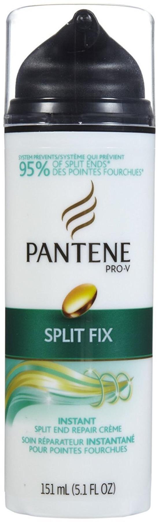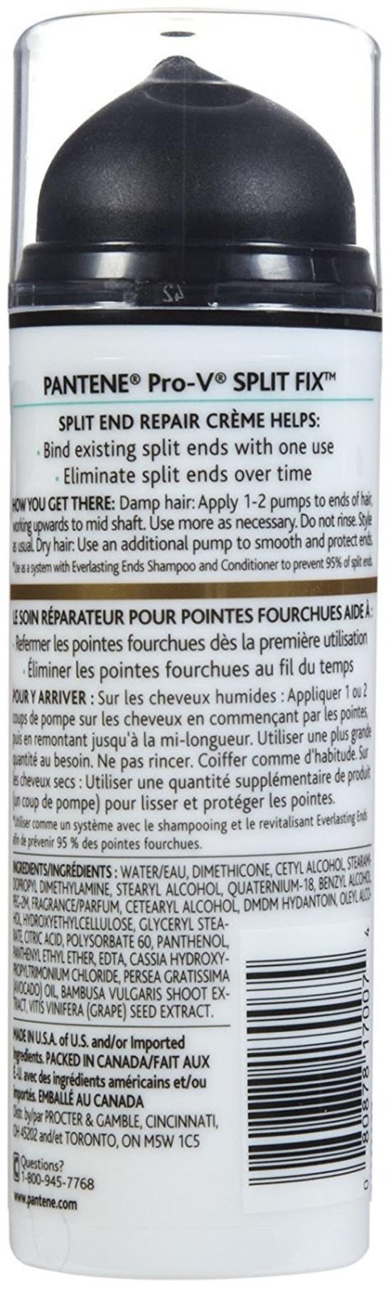 Repair Creme, Split End, Split Fix, Pro-V, Tube 5.1 OZ System prevents 95% of split ends (e a system with Everlasting Ends Shampoo and Conditioner to prevent 95% of split ends). Split End Repair Creme Helps: Bind existing split ends with one e; eliminate split ends over time. Questions? 1-800-945-7768. www.pantene.com. Packed in Canada. A of and/or imported ingredients. How You Get There: Damp hair: Apply 1-2 pumps to ends of hair, working upwards to mid shaft. e more as necessary. Do not rinse. Style as ual. Dry hair: e an additional pump to smooth and protect ends. 5.1 fl oz (151 ml)
