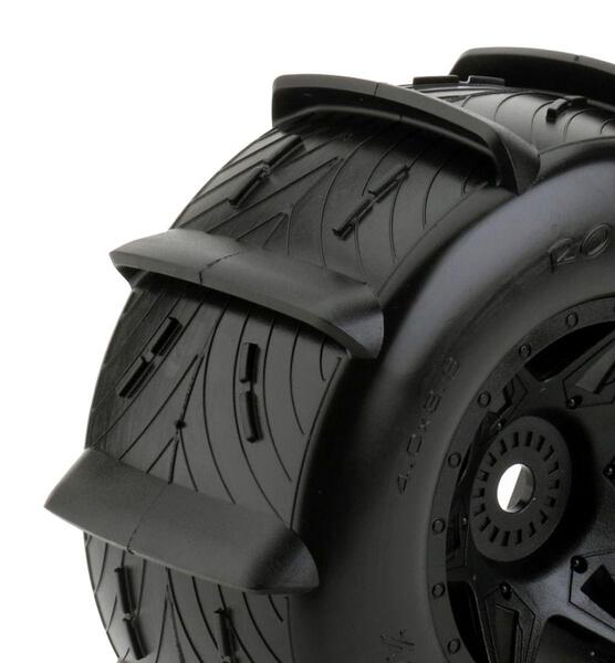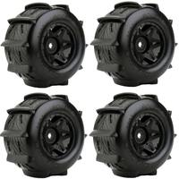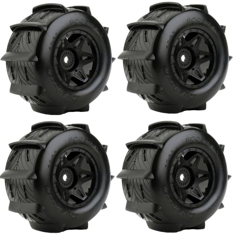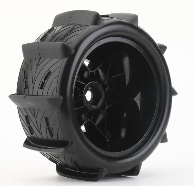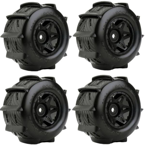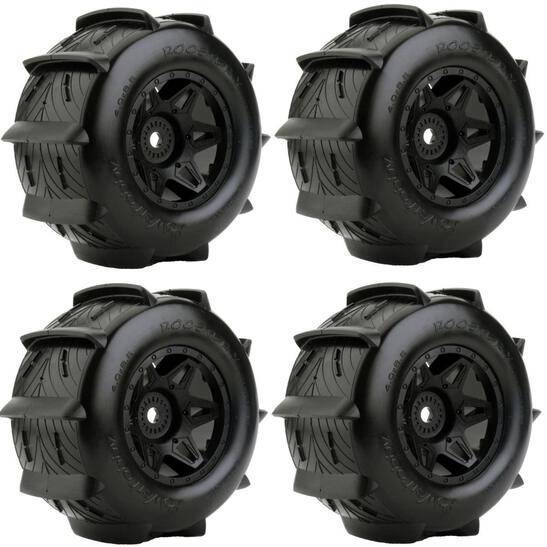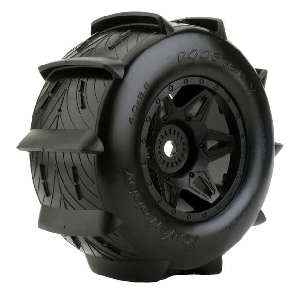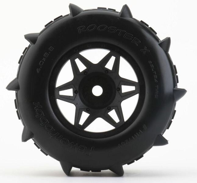 This is a pair of pre-mounted Rooster X Sand or Snow Truck Tires. These tires are belted, so no more tire ballooning. The Rooster tires provide hours of fun in the sand, snow, or even in the occasional mud pit. The paddles ensure maximum performance due to the true scoop design coupled with low roll outer sidewalls.