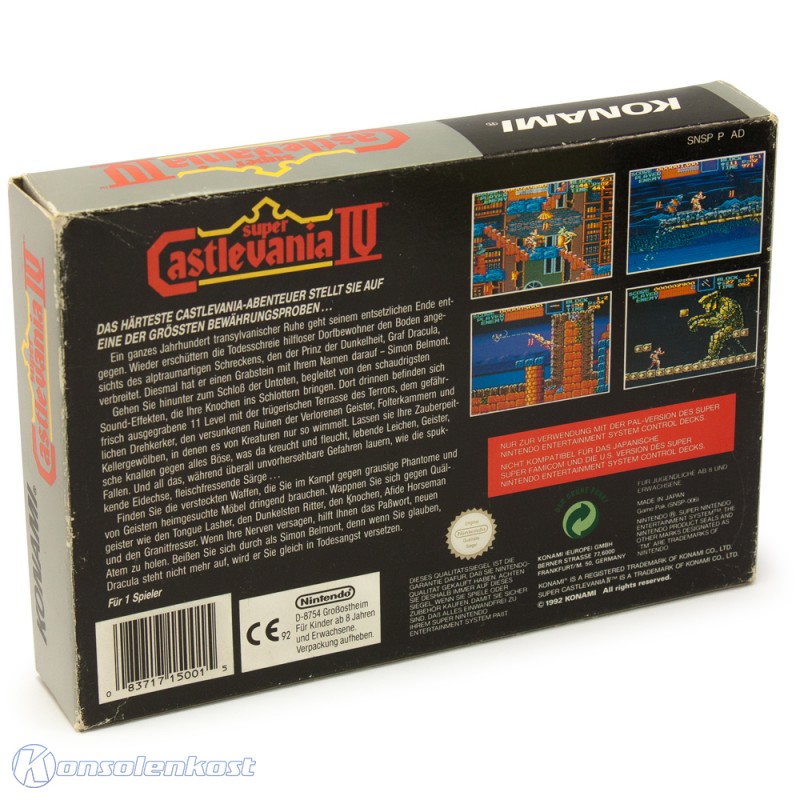 Ein ganzes Jahrhundert transylvanischer Ruhe geht seinem entsetzlichen Ende entgegen. Wieder erschüttern in Super Castlevania IV für SNES die Todesschreie hilfloser Dorfbewohner den Boden angesichts des alptraumartigen Schreckens, den der Prinz der Dunkelheit, Graf Dracula, verbreitet. Dies mal hat er einen Grabstein mit Deinem Namen - Simon Belmont. Gehe hinunter zum Schloß der Untoten, begleitet von den schaurigsten Sound-Effekten, die Deine Knochen ins Schlottern bringen. Dort drinnen befinden sich frisch ausgegrabene 11 Level mit der trügerischen Terrasse des Terrors, dem gefährlichen Drehkerker, den versunkenen Ruinen der Verlorenen Geister, Folterkammern und Kellergewölben, in denen es von Kreaturen nur so wimmelt.