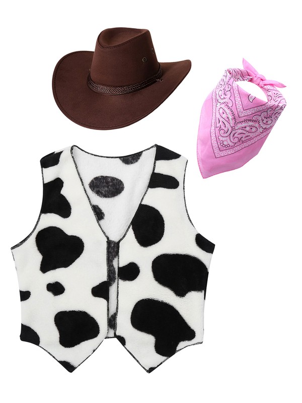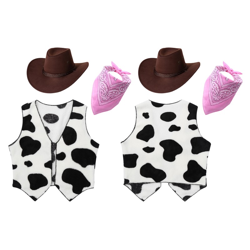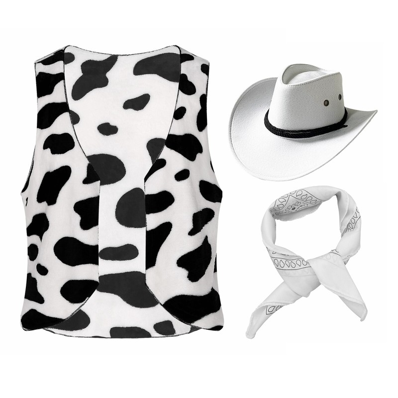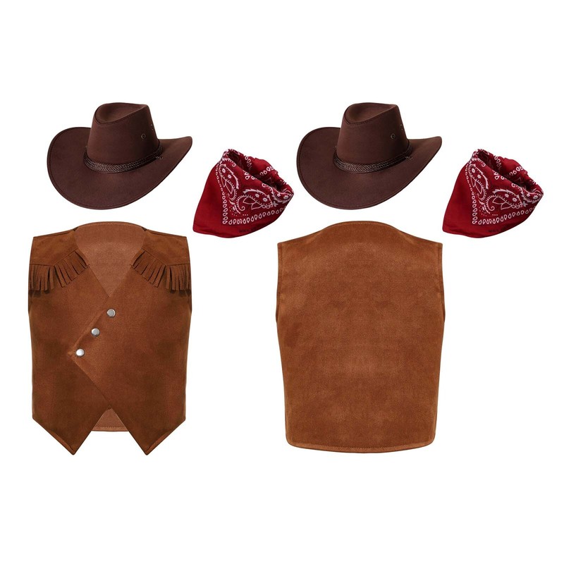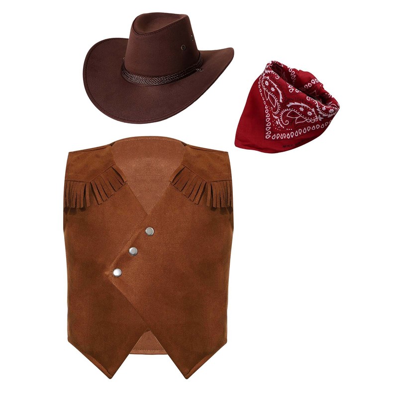 3-piece cowboy suit includes vest, bandanna and cowboy hat, already-matched suit for party. The size is suitable for most teens.