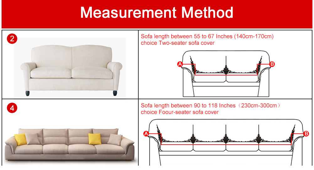 1. HIGH STRETCH SUPER FIT MATERIAL: This fitted sofa slipcover is perfect to cover your sofa in a tightly knit way to give a wrinkle-free look with perfect effect. The non-slip foam articles are provided to be put into the seat cushion creases to make the cover stay in place providing clean look with soft and comfortable feel. Naturally dyed with no color shading or fading done. 2. MULTIPURPOSE ALL-ROUND PROTECTION: The elastic couch covers suitable for most types of sofas. Neat stitching; 360 degrees Full coverage. Freshens up any home decor! This elastic universal couch slipcover provides total protection for your sofas keeping your furniture away from stains, pet hair, dirt, claws, wear and tear, other damages. It's great for the families with kids, cats and dogs or for anyone seeking an economical solution for furniture protection. 3. FRESHEN YOUR HOME DECOR: These pattern printed sofa slipcovers with great variety of exquisite unique designs and color add elegance to your home decor which instantly brighten up your old furniture. The universal couch covers suit for normal 2/4 cushion couch. 4. EASY INSTALLATION & CARE: This sofa slipcover is very easy to install due to its highly stretchable spandex fabric and elastic bottom. Machine washable in cold water. Wash separately at gentle cycle using mild laundry detergent. Do not bleach. 5. NOTE: The color of the products shown may be slightly different with the real product due to different shooting devices and display effects. Features: 1.Protect Your Furniture / Couch From Stains, Pet Hair or Damage. 2.Made from 92% polyester and 8% spandex material, environmental-friendly and durable. 3.Having good properties of high-elasticity, crease-resistance, slip-resistant and super soft. 4.Easy to set up. 5.Easy to clean and wash, it is washable and reusable. Please kindly check our measurement method! ![]() Size Reference: