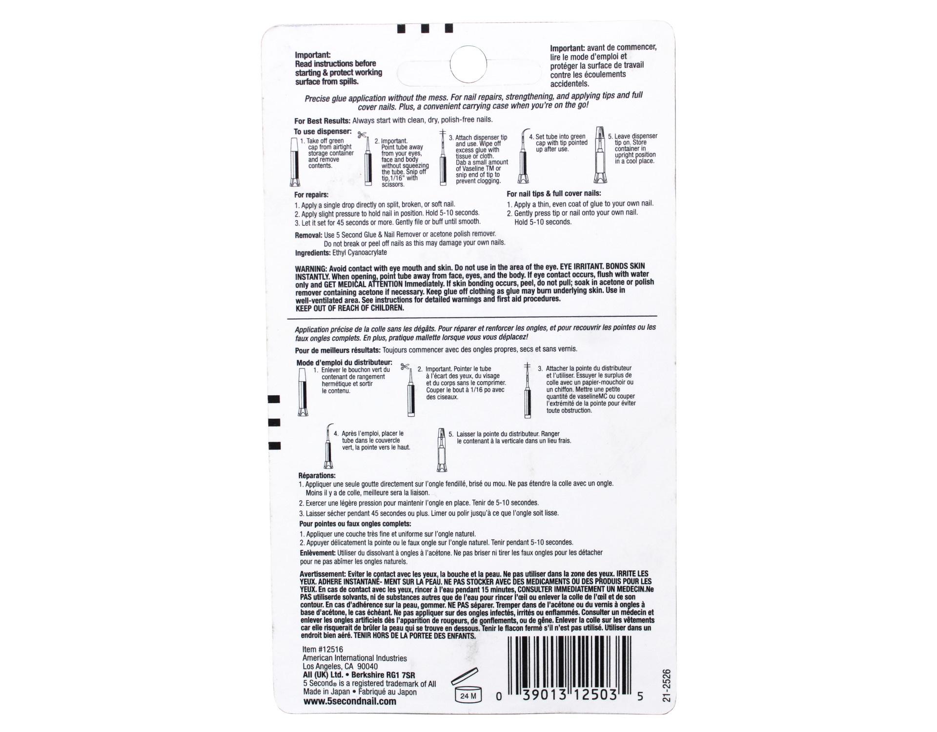 #1 seller of nail gluePrecise glue application without the mess. For nail repairs, strengthening, and applying tips and full cover nails. Plus, a convenient carrying case when you're on the go!Salon Nail GluePinpoint applicator controls one drop at a time.Gentle & Hypo-allergenic Instantly repairs & strengthens natural nail For all artificial nails & nail tipsMade in JapanWarningsEye and skin irritant. Bonds skin instantly.Contains Ethyl Cyanoacrylate. Avoid contact with skin and eyes. If eye or mouth contact occurs, hold eyelid or mouth open and rinse thoroughly but gently with water for 15 minutes and seek medical attention. Liquid glue will sting eye temporarily. Solidified glue may irritate eyelike a grain of sand and should be treated by an eye doctor. If skin burning occurs, soak in acetone-based nail polish remover or warm soapy water and carefully peel or roll skin apart (do not pull). Contact through clothing may cause skin burns. If spilled on clothing, flush with cold water. Avoid prolonged breathing of vapors. Use with adequate ventilation.Keep out of reach of children.American International Industries 5 Second Nail Salon Nail Glue, 0.07 Oz