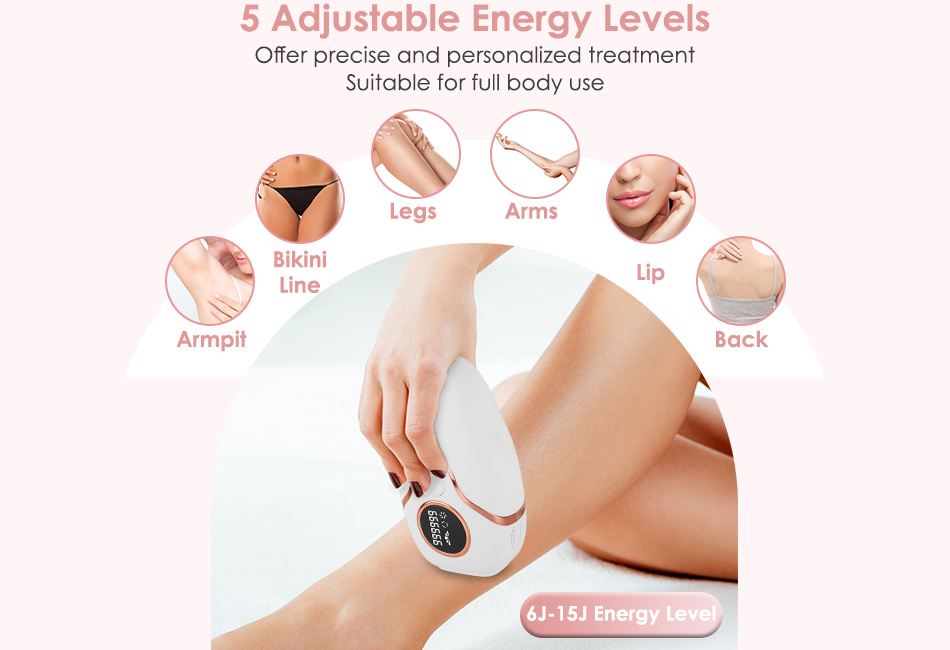 - 5 Energy Levels & Painless Ice Cooling System:Featured with 5 adjustable energy levels ranging from 6J to 15J,our permanent hair removal offers the most precise and personalized treatment according to different skin areas,growth cycles or skin sensitivity. Upgraded quartz lamp with cooling system lowers the operating temperature to 50°F minimum,alleviating burning sensation and preventing skin redness during the painless and acceptable hair removal process.