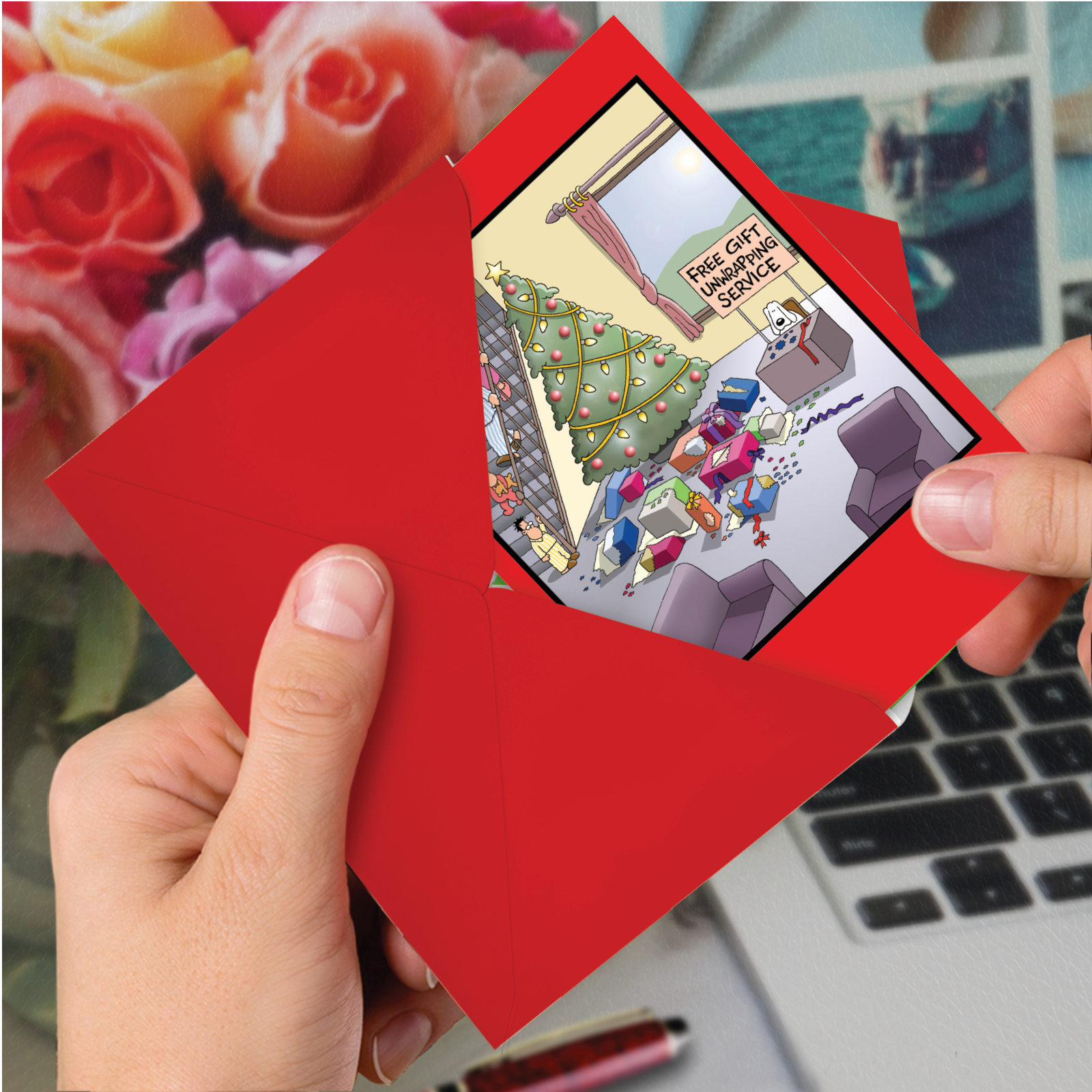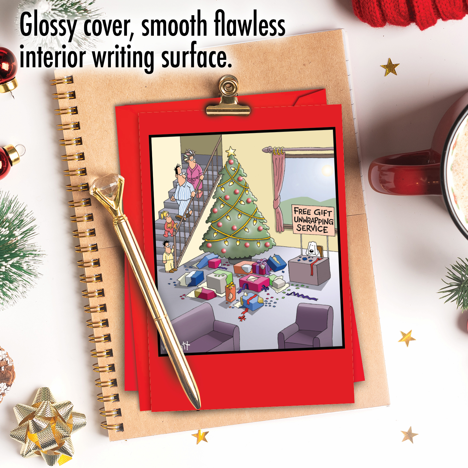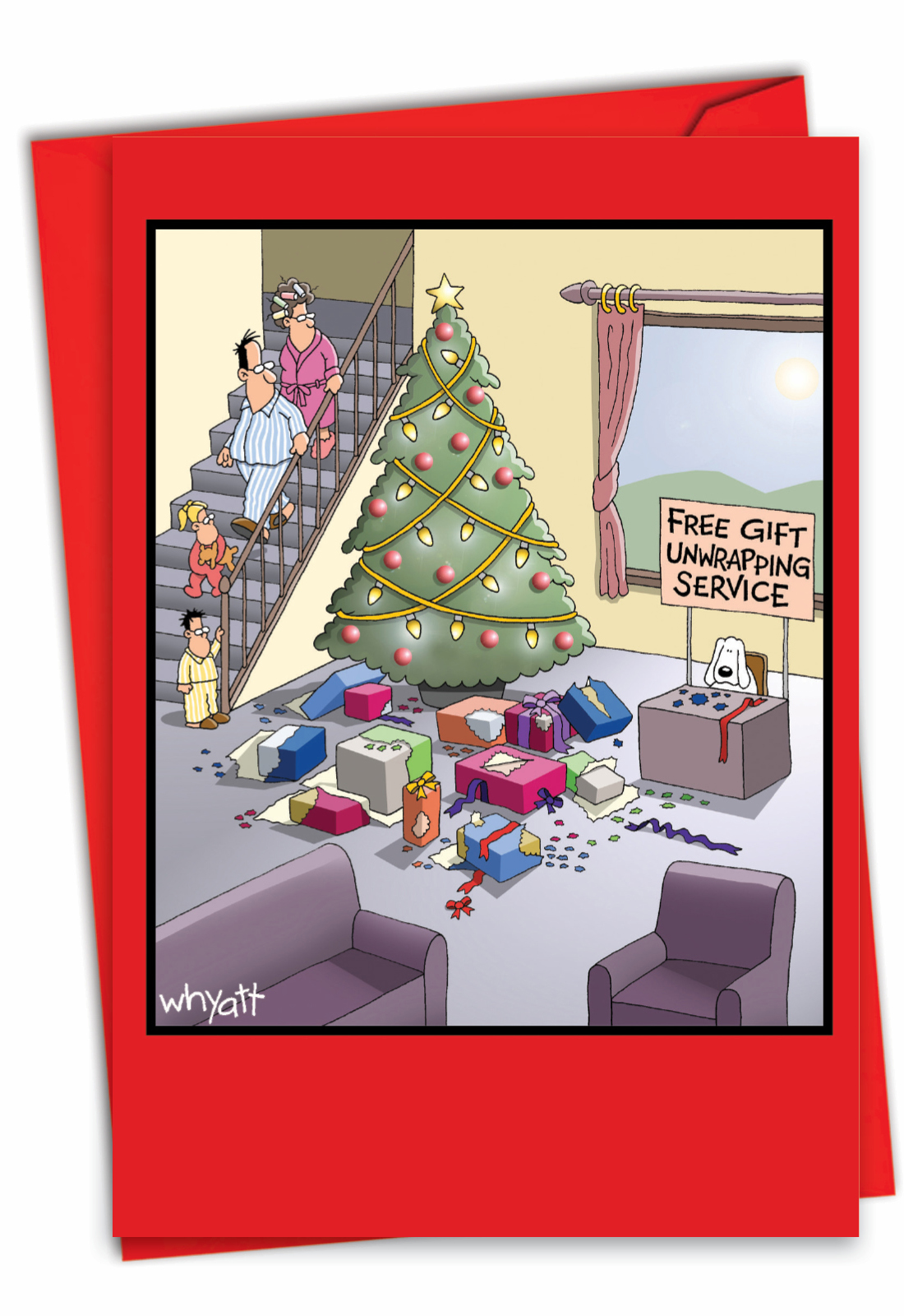 Pets have a field day with the wrapped presents around a Christmas tree. NobleWorks Cards uses this common occurrence in a Gift Unwrapping Service Cartoons Christmas Card. If you have friends and family members who have a pet and have experienced their penchant for attacking gifts that don't belong to them, this is the ideal card to give when looking for funny Christmas cards. The dog on the card has set up a booth with a sign saying, "Free Gift Unwrapping Service" and has already completed his duties as a disappointed family looks on at Christmas morning. Stand out from the crowd and get a laugh with greeting cards from NobleWorks.