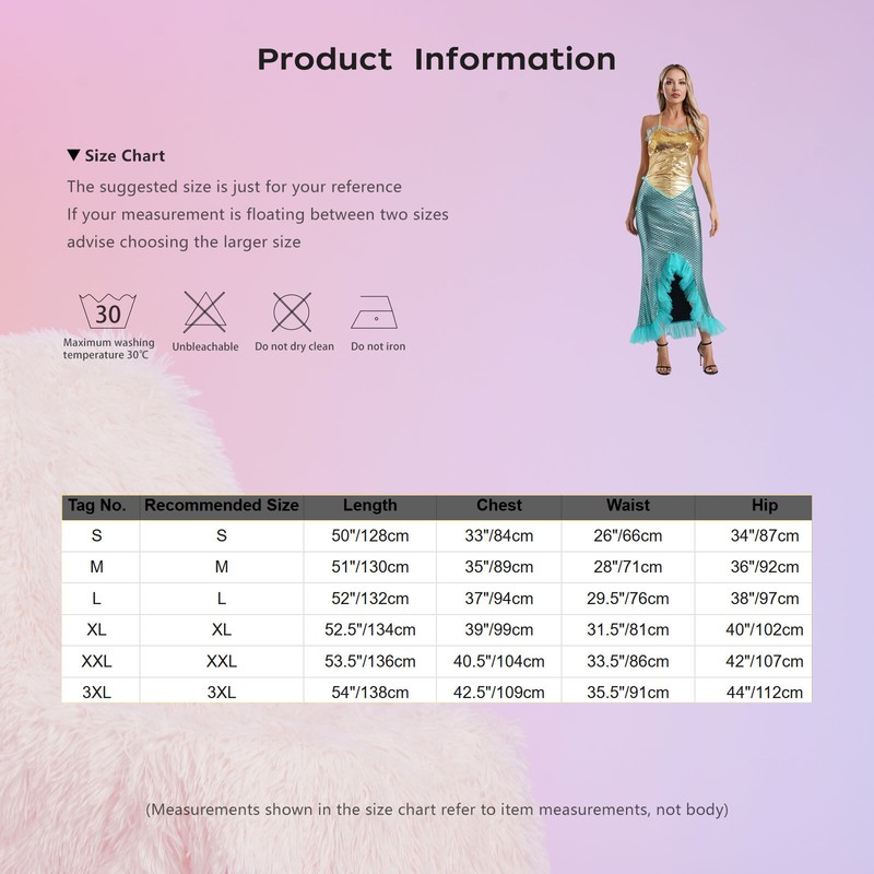 Suitable for Halloween, stage performance, photography, dress-up party, masquerade, festivals, carnivals, water park performance and so on.Size Chart: The suggested size is just for your reference. If your measurement is floating between two sizes, advise choosing the larger size. (Measurements shown in the size chart refer to item measurements, not body)