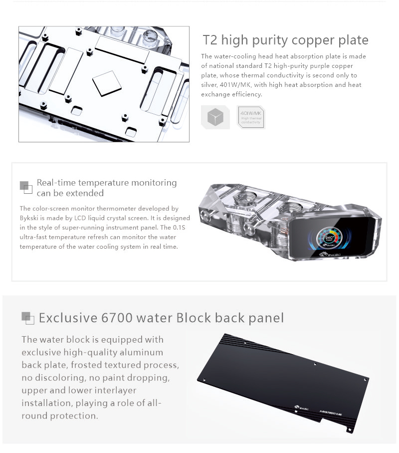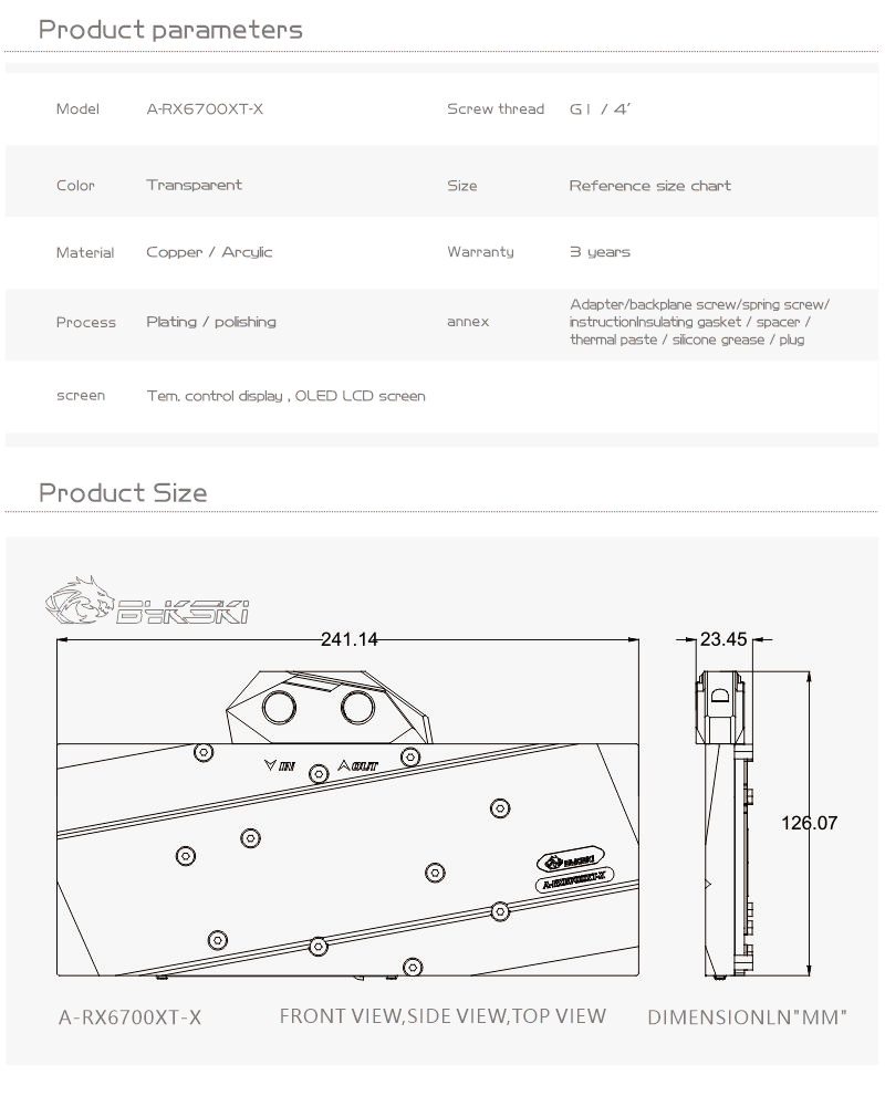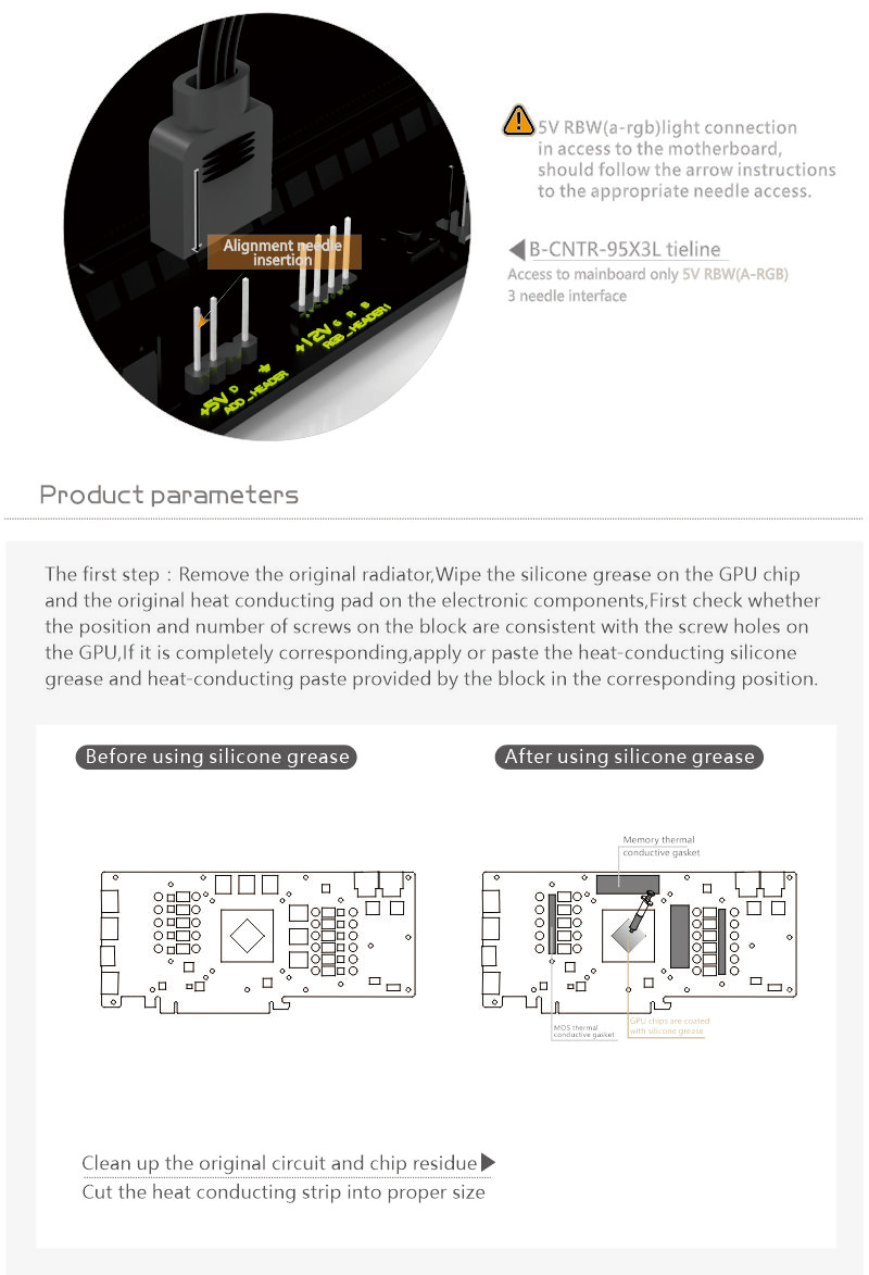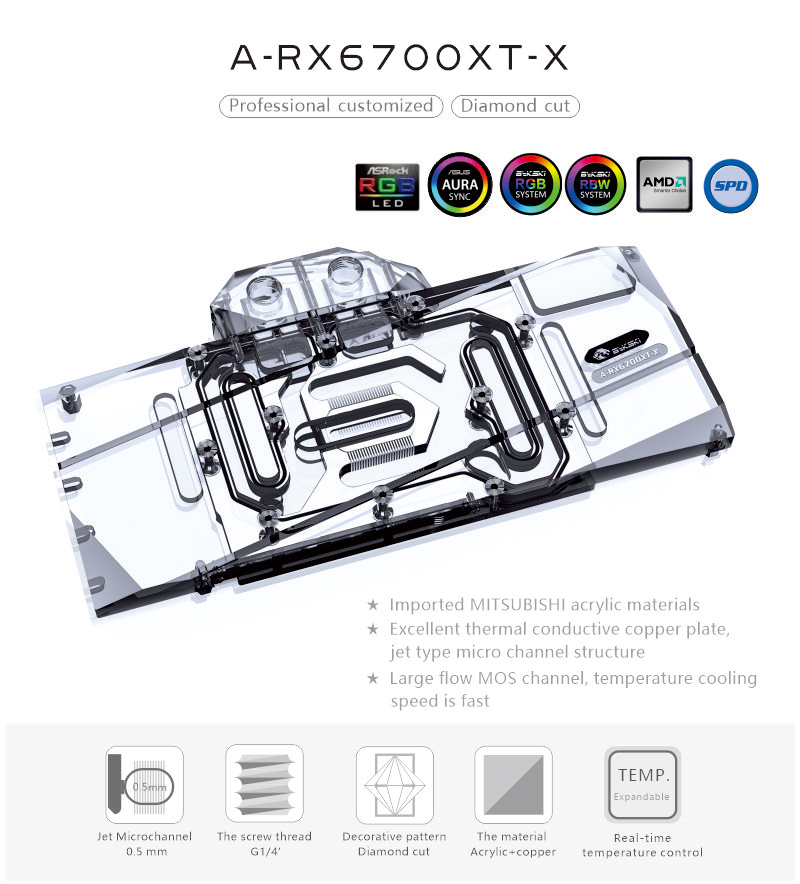 | Block with 0.4MM micro channel injection design, all designed only for performance! Direct cooling of the graphics core (GPU), memory (RAM) key heating parts of the graphics, to ensure stability when overclocking. Block using large flow design, even if low raise pump can use it. Block made by high purity copper, and electroplating to prevent oxidation and makes beautiful. The upper cover using high quality POM materials or acrylic to ensure block long life and durability. Inlet and outlet can change direction free, easy to build CF and Crossfire system. Support 12v RGB and 5v RGB by installing led strip options. Caution: 1.Please double check the graphics card detail model to ensure compatibility 2.Connecting fitting shown on photos not included. 3.Block build-in 5v RGB(3pin) Led strip, if you need 12v RGB led strip, contact me after purchasing. RGB Controller B-RGB-C8 and B-RBW-C8, get it in my shop please. Packing List 1.Block 2.End Cap x 2 3.Silicone Grease Film x 1 4.Screws Compatible List (Including but not limited to the following models) AMD Reference Radeon RX 6700XT Sapphire Radeon RX 6700XT Nitro+ The following are some compatible graphics cards and PCB photos, for reference only, if you can not determine the compatibility, please consult us before purchase.           |