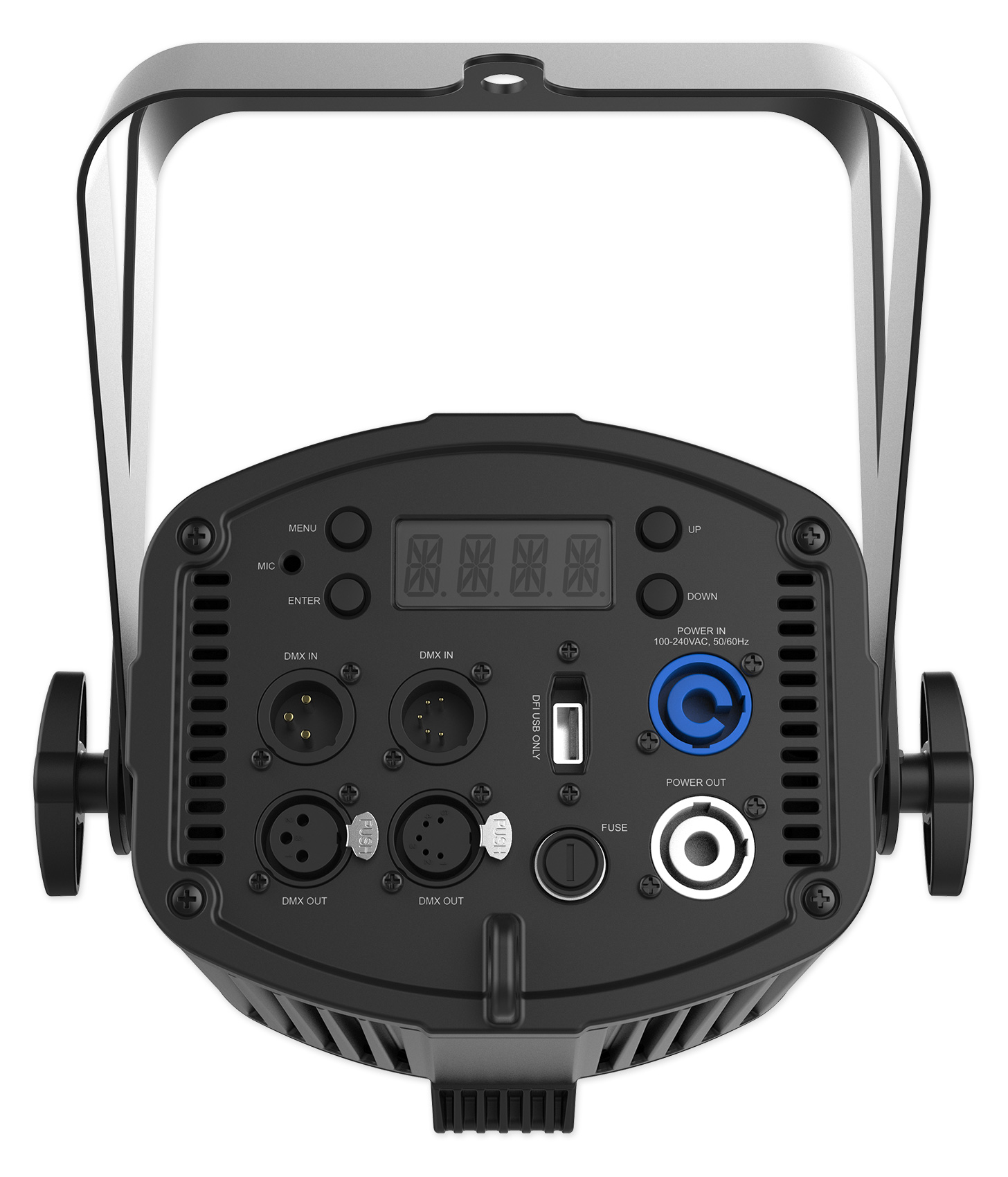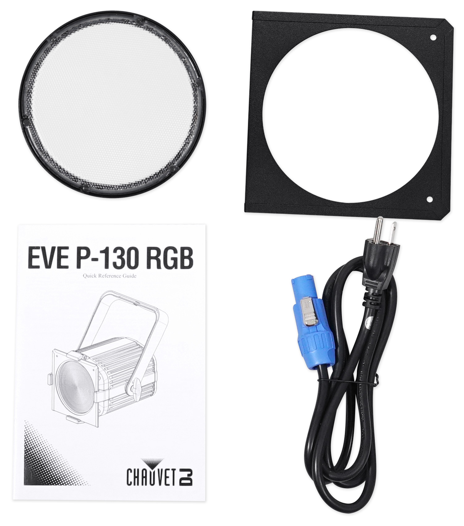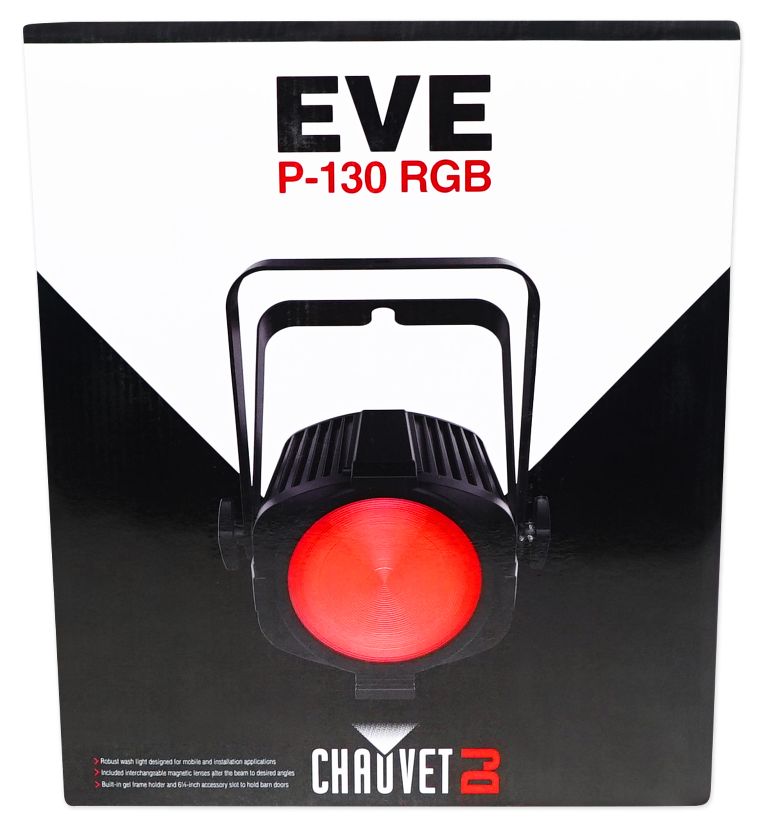 EVE P-130 RGB is a robust RGB wash light designed for mobile lighting entertainers. Interchangeable magnetic lenses are included to alter the beam to desired angles. EVE P-130 RGB has a sturdy cast aluminum housing that provides extra strength without added weight. D-Fi USB compatibility is also onboard providing the option for wireless master/slave or DMX control. Its fanless design ensures 100% silent operation and the unit’s high-frequency LED dimming offers flicker-free operation perfect for video use. EVE P-130 RGB has a built-in gel frame holder and 6¼-inch accessory slot to hold barn doors. Flexible control connection options are onboard with both 3- and 5-pin DMX connectors. PowerCON®-compatible power input/output connections allow secure power linking.
