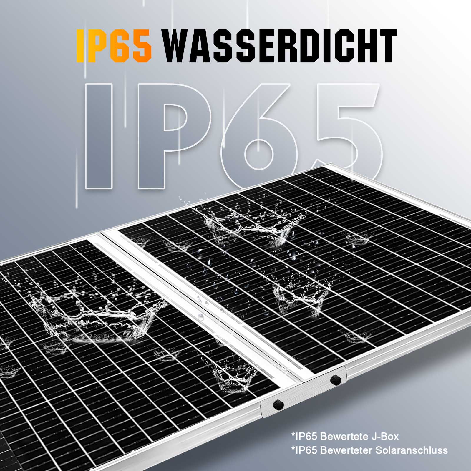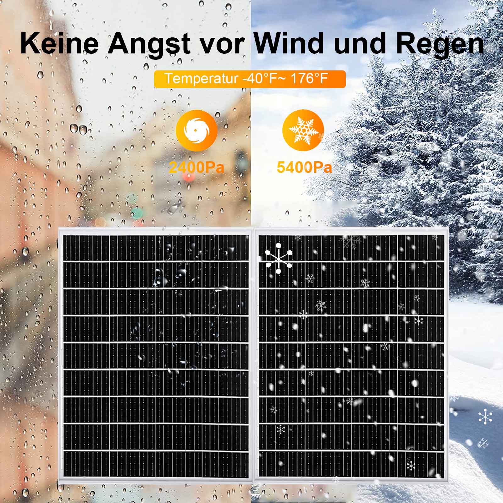 A: Die Betriebstemperatur des Solarmoduls beträgt -20°C-85°C (-4°F-185°F). Um die Lebensdauer des Panels zu verlängern, stellen Sie sicher, dass das Produkt keinen äußeren Kräften/Stößen ausgesetzt wird, wenn es nicht in Gebrauch ist. Das Solarmodul selbst besteht aus Glas und darf nicht fallen gelassen, durchstochen, verbogen oder aufgesessen werden. Diese Einwirkungen können das Glas zerbrechen und das Modul unbrauchbar machen.