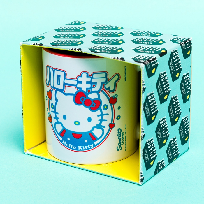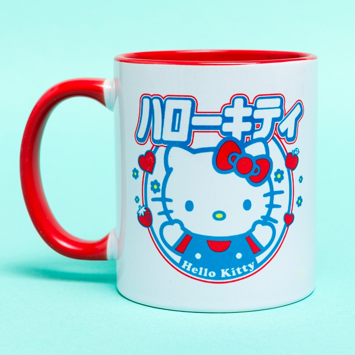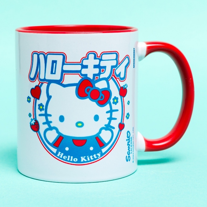 Sanrio Hello Kitty Japanese Logo Red Handle Mug There's a reason why Hello Kitty has been a long standing short-hand for all things cute in Japanese pop culture. Who could resist those ears, that button nose and the dinky hair bow? We've taken inspiration from the original Japanese logo for this super-kawaii mug we've designed in-house. Finished with a red handle and interior, it's perfect to enjoy your favourite tea or coffee from - along with a freshly baked cookie, of course!