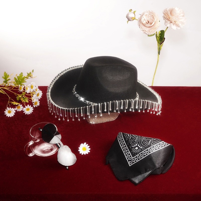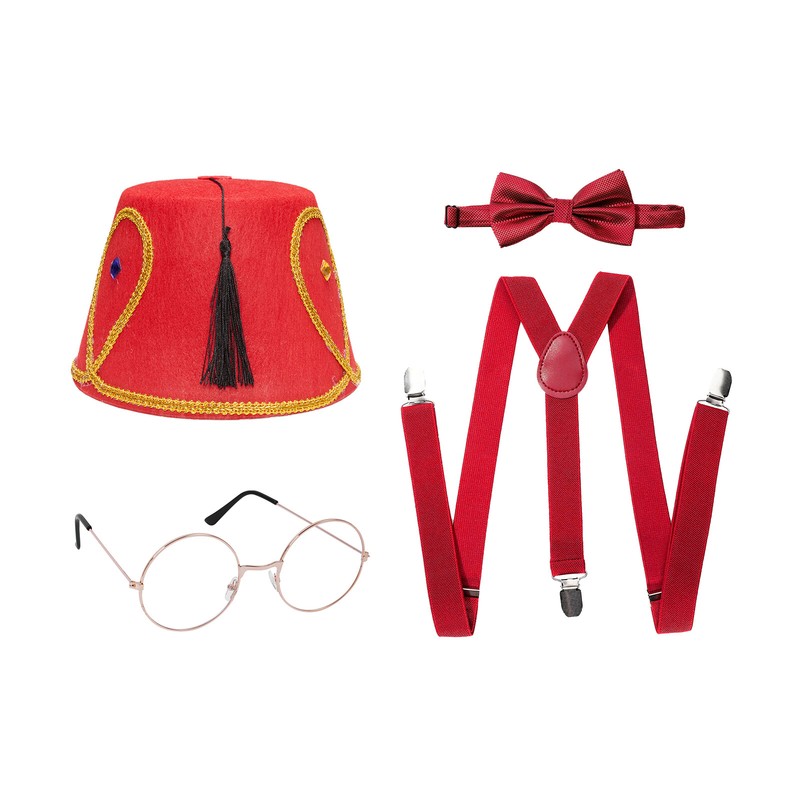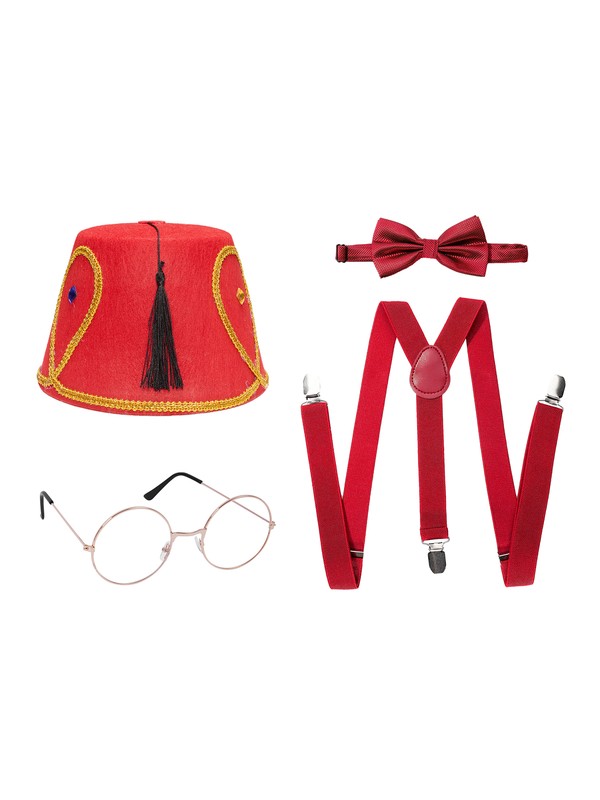 The hat adopts bright red color and matches with suspenders, bowknot and glasses, creating an exotic and attractive appearance.