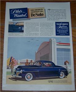 1941 De Soto Life Magazine Advertisement. Pilots Wanted For America's Smartest Car. Ad is 14" high and 10" across. Good condition. Suitable for framing.