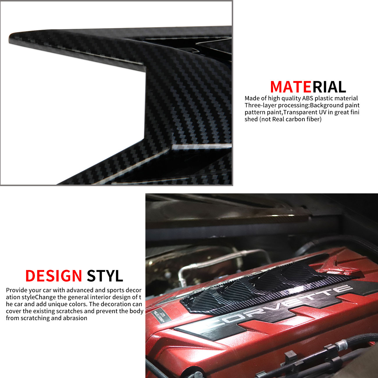 1) Made of high quality ABS plastic, the surface is Carbon Fiber Grain, the material in great finished.(not Real carbon fiber)