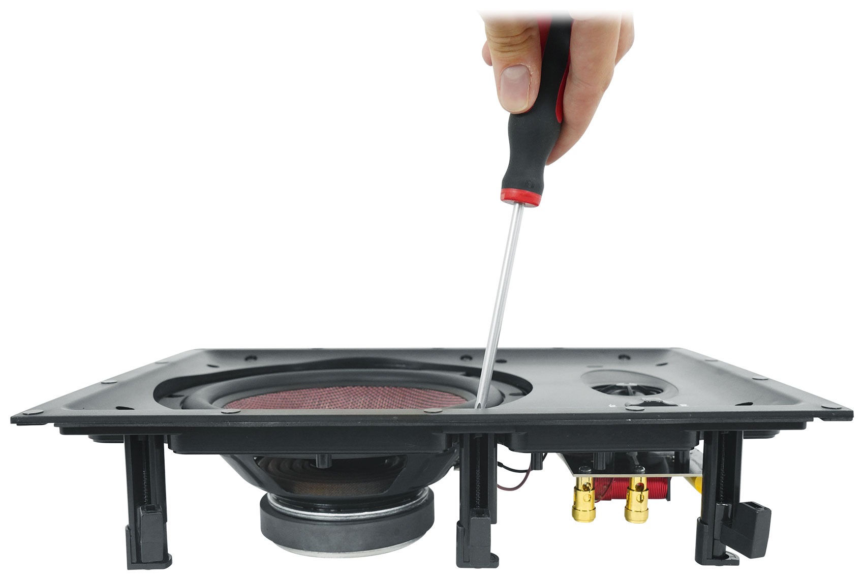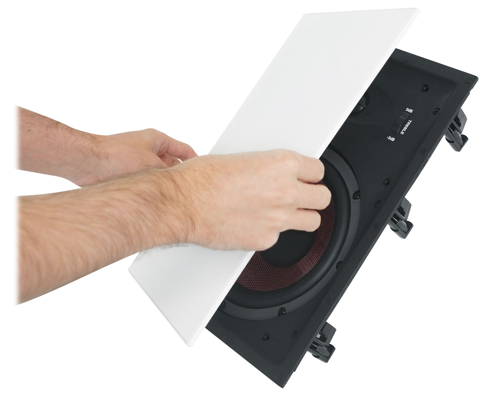 You can even customize the amount of high frequencies using the 2-way switch on the front panel. Access is super easy with the removable magnetic grill.