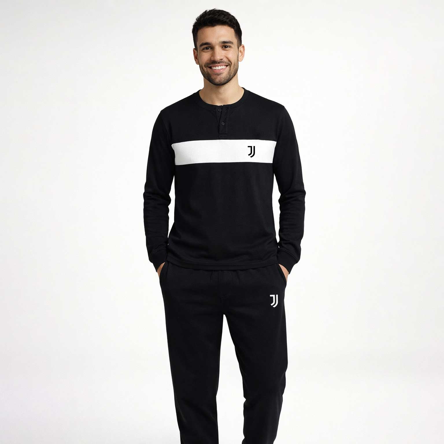 Il design è caratterizzato da una maglia a serafino con bottoni neri, in caldo cotone nero, con una distintiva fascia bianca sul petto e il logo Juventus sul lato cuore. Il pantalone nero completa il look, rendendo questo capo perfetto per il relax in famiglia.