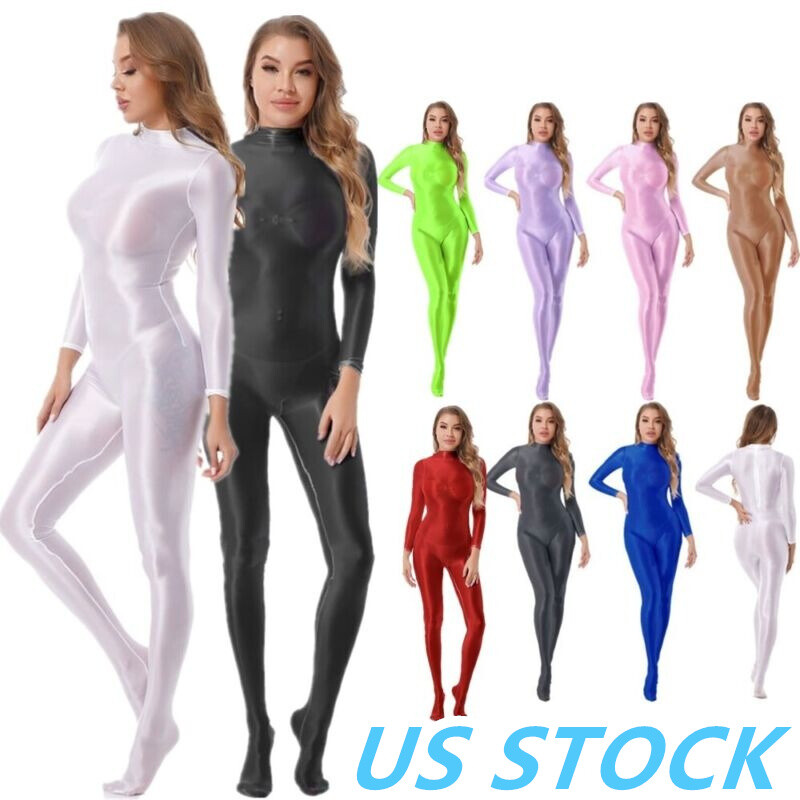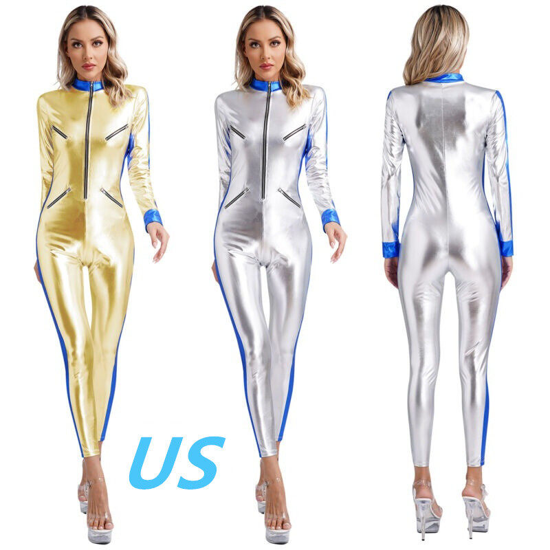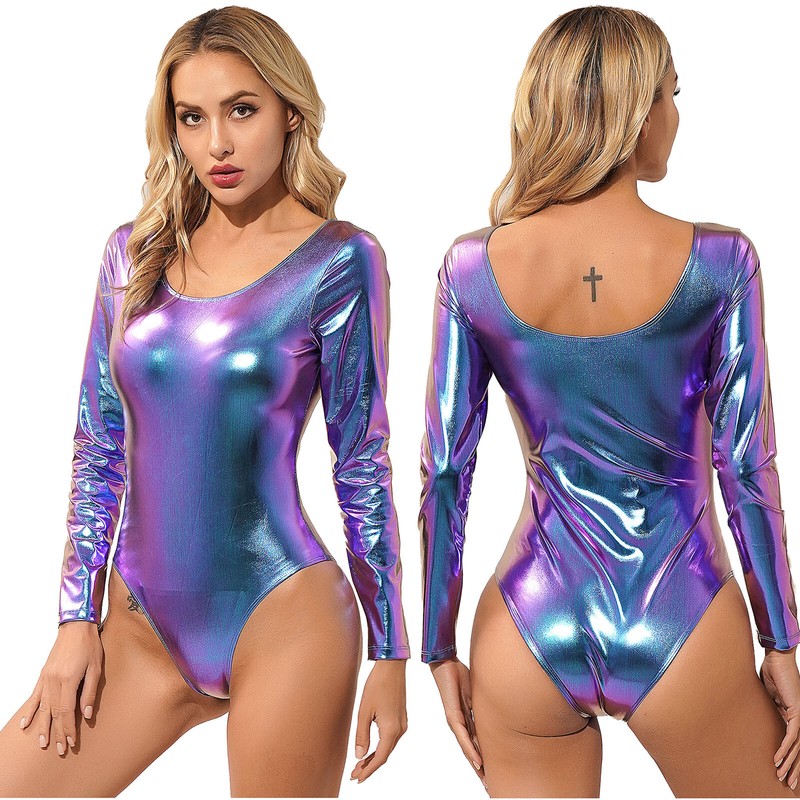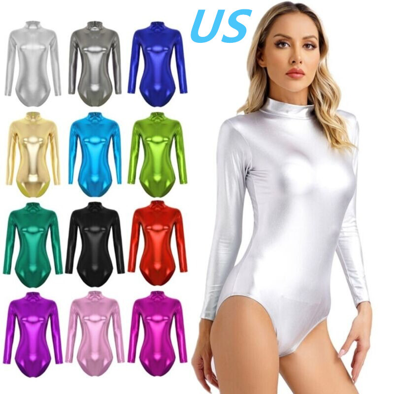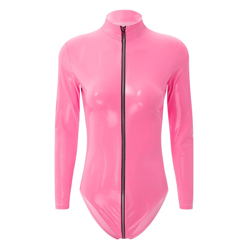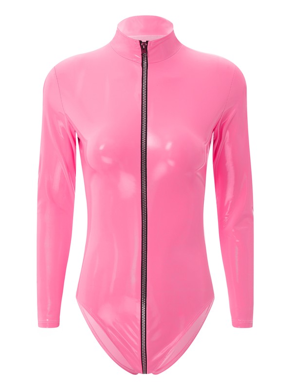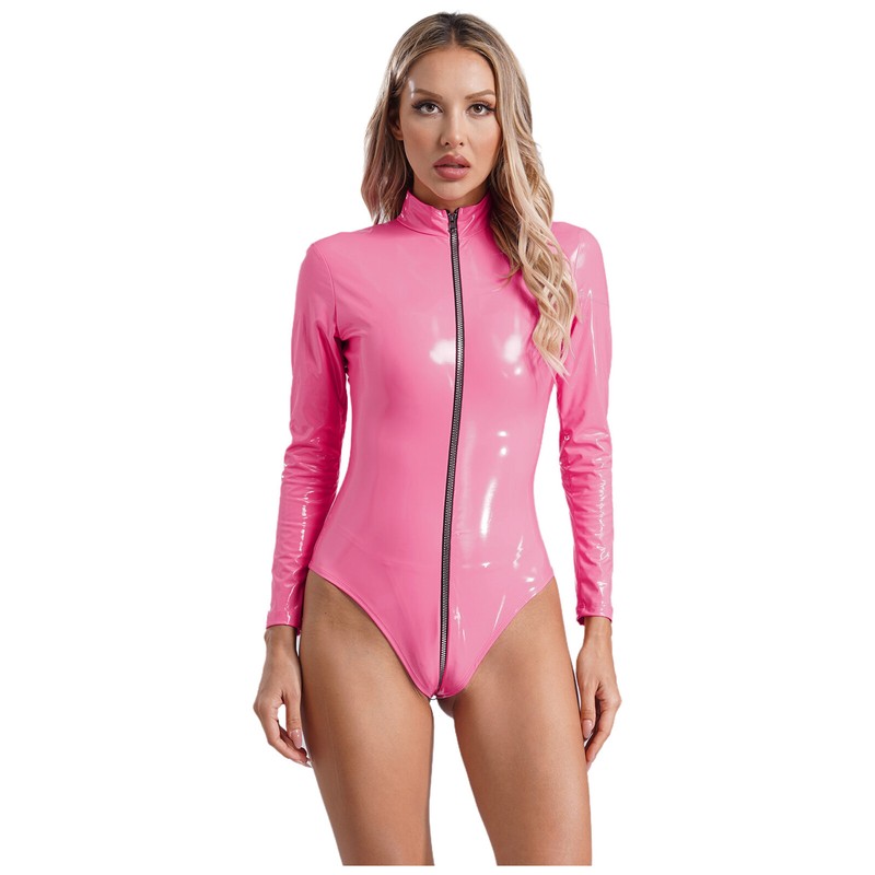 One-piece bodysuit is designed with stand collar, long sleeve, short bottom and 3-end zipper and slim fit, making you very sexy.
