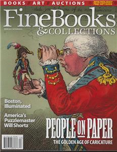 Fine Books and Collections Magazine Autumn 2016. Caricature on the cover. Articles include Holiday Gift Guide, Medieval Past, Puzzle Books, Auction Guide, Caricature, Diane Arbus, and more. Filled with wonderful book illustrations and advertising. Magazine is in good condition, wear at edges