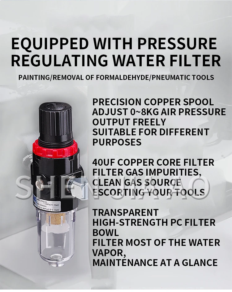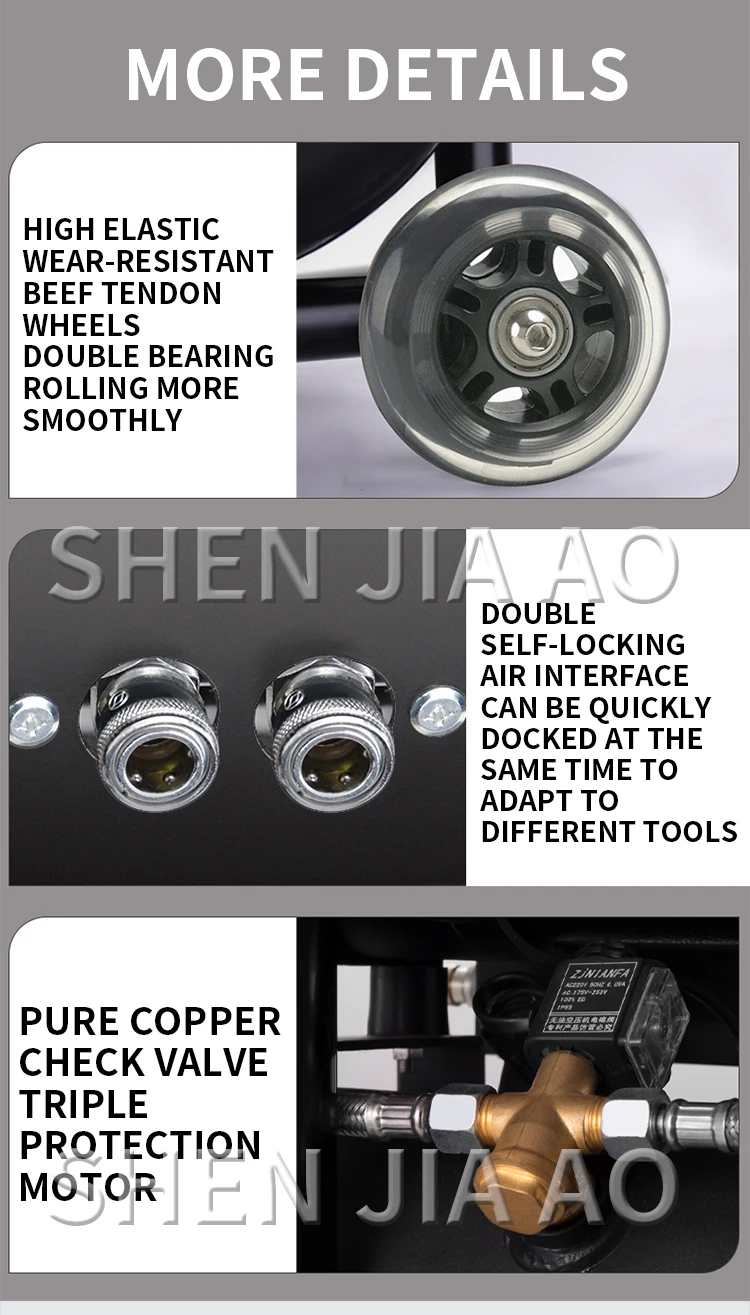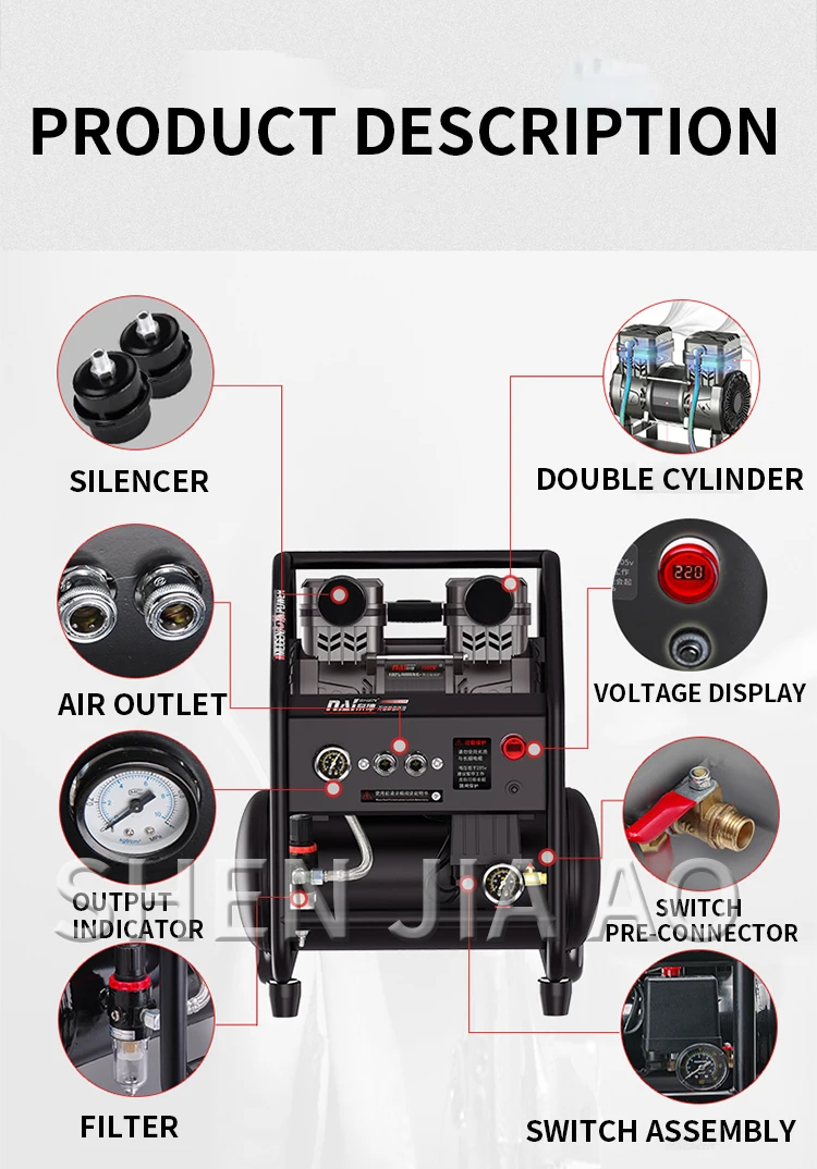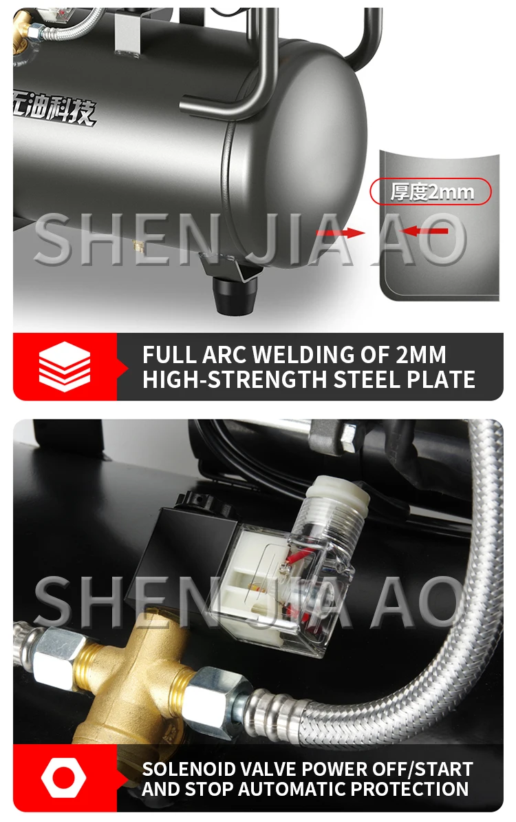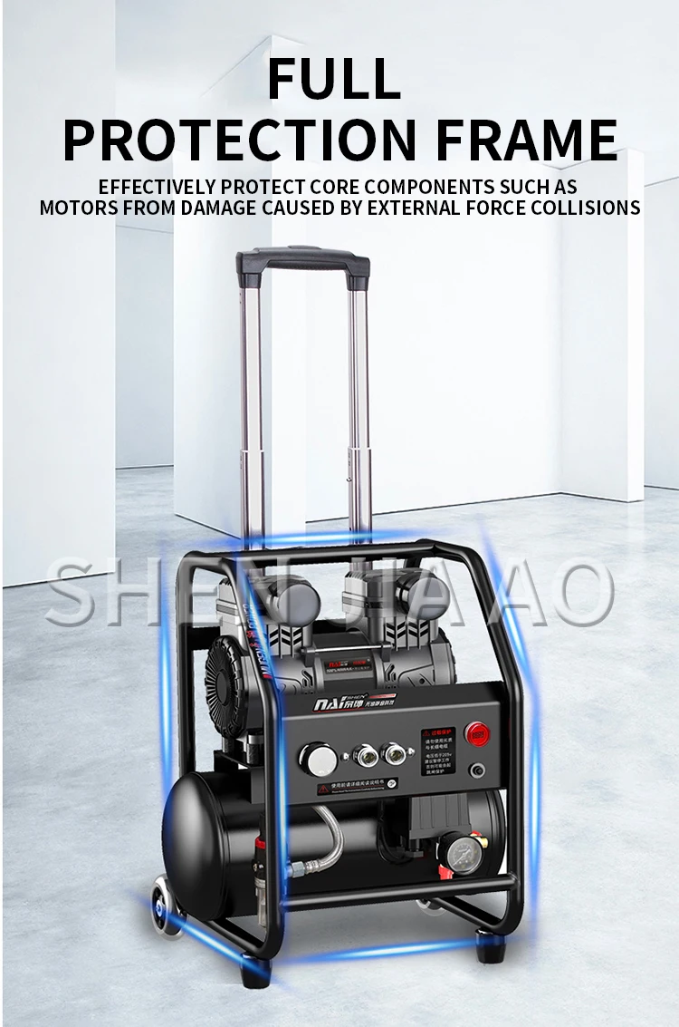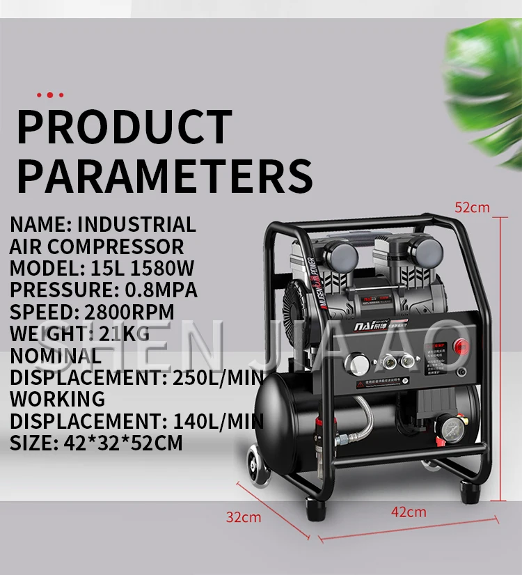 Name: Industrial Air Compressor Model: 15L 1580W Pressure: 0.8mpa Speed: 2800rpm Weight: 21kg Nominal displacement: 250L/min Working displacement: 140L/min Size: 42*32*52cm
