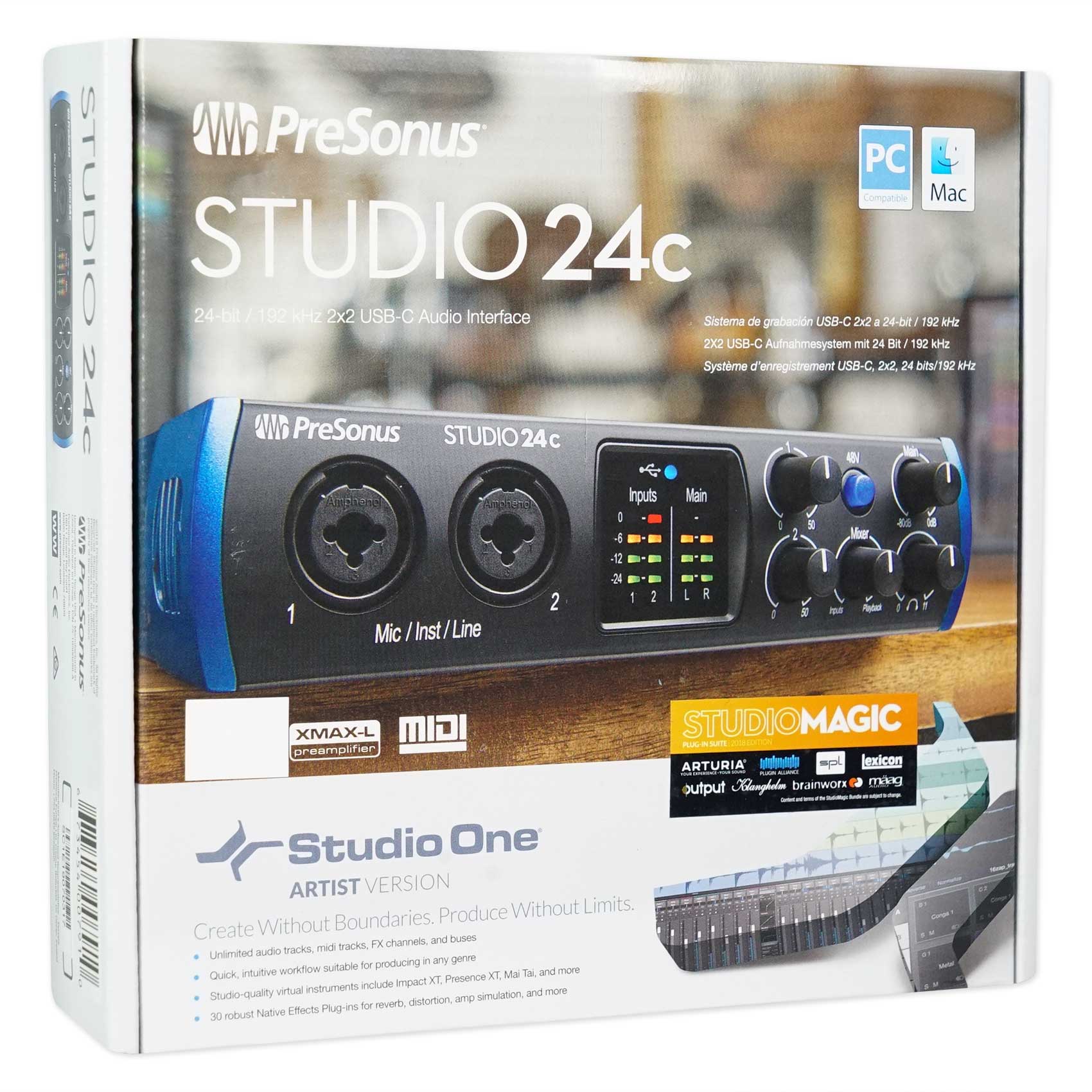 Great for recording studios, mobile musicians, guitarists, podcasters, and live streaming, the bus-powered Studio 24c 2-in, 2-out audio interface features 2 front-panel combo mic/line/instrument inputs with PreSonus® XMAX-L solid-state mic preamps, 2 rear-panel line outputs, MIDI I/O, and onboard direct monitoring control. A complete, all-in-one home recording studio, the Studio 24c comes with PreSonus’ award-winning Studio One® Artist music production software for macOS® and Windows®.