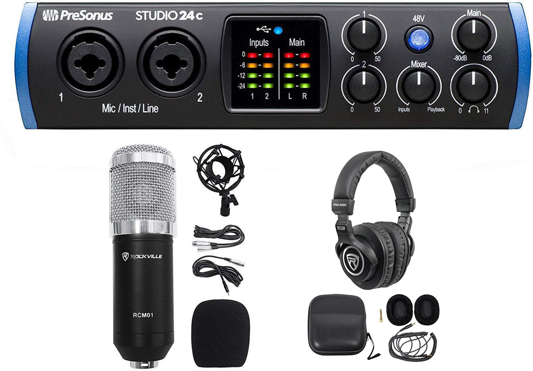 Package: Presonus STUDIO 24C 2x2 USB-C Audio MIDI Recording Interface, 2 XMAX Mic Preamps + Rockville RCM01 Pro Studio Recording Condenser Microphone Mic With High Quality Metal Construction and Shock Mount + Rockville PRO-M50 Studio Headphones w/ Detachable Coil Cable, Case+Extra Ear Pad