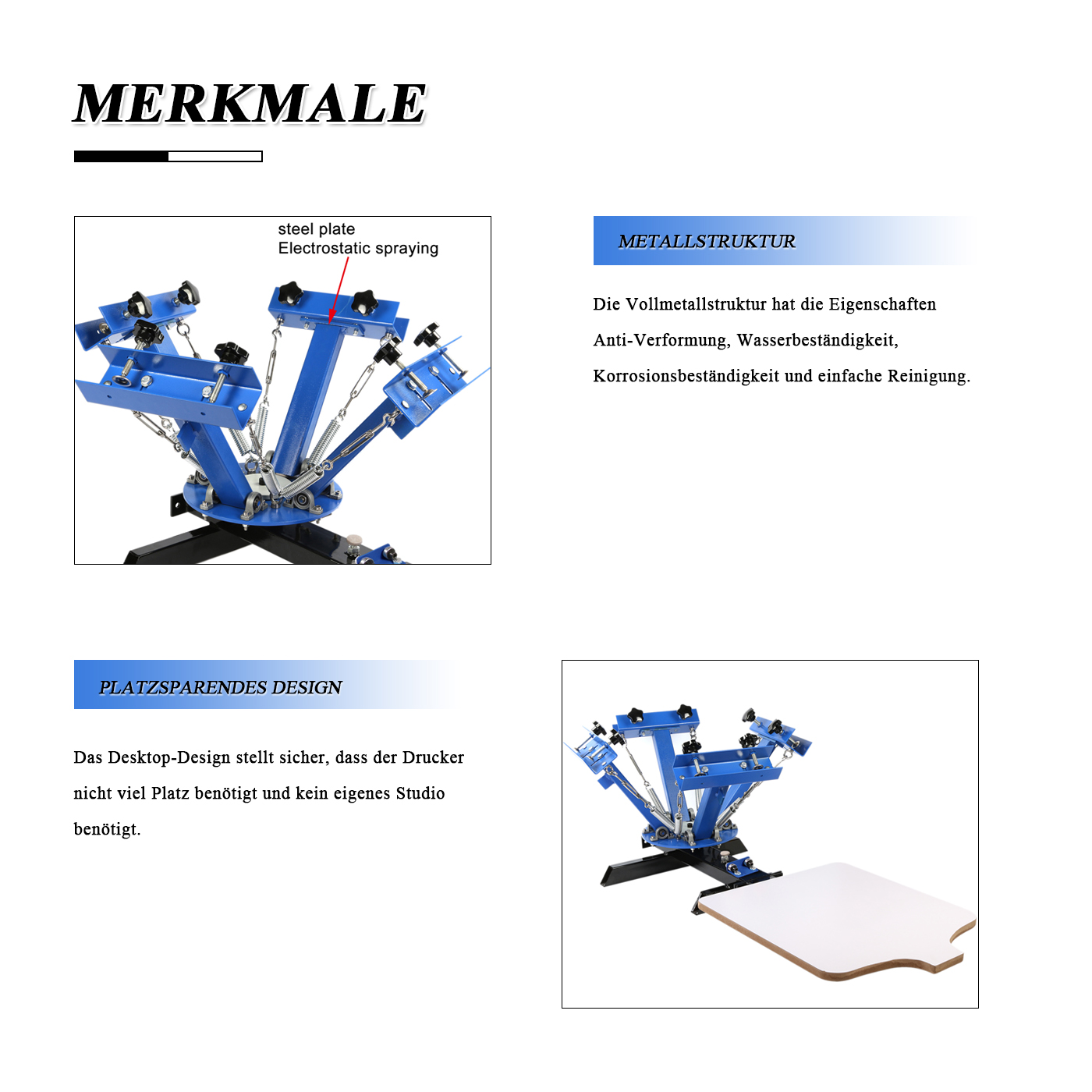 Vierfarbiger 1-Stationen-Bildschirmdrucker (4 Farbe) Das Siebdruckkit ist einfach zu bedienen und eignet sich besonders für den einfarbigen T-Shirt-Siebdruck. Der Körper aus hochwertigen Materialien ist langlebig. Die Gesamtkonstruktion ist einfach und platzsparend. Es kann zum Bedrucken von Substraten verwendet werden, die eine Überdruckung erfordern, wie z.B. Kissenbezüge, Taschen, Vliesstoffbeutel usw.