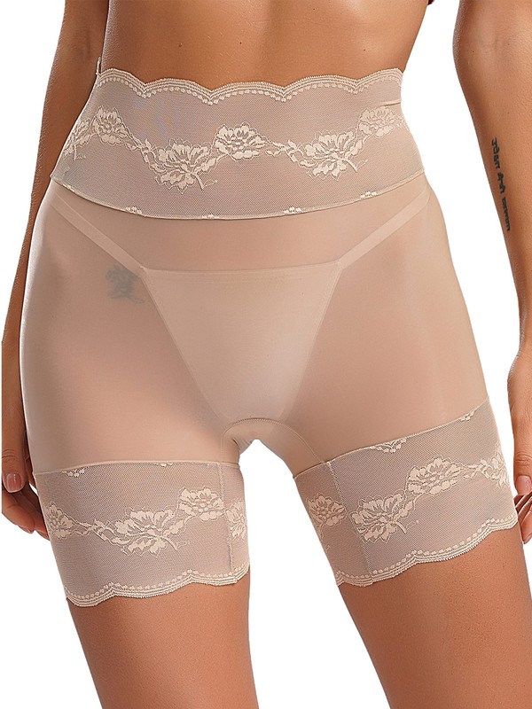 High waist, wide elastic waistband, flower embroidered lace at waist and legs, thigh length four corners underwear.