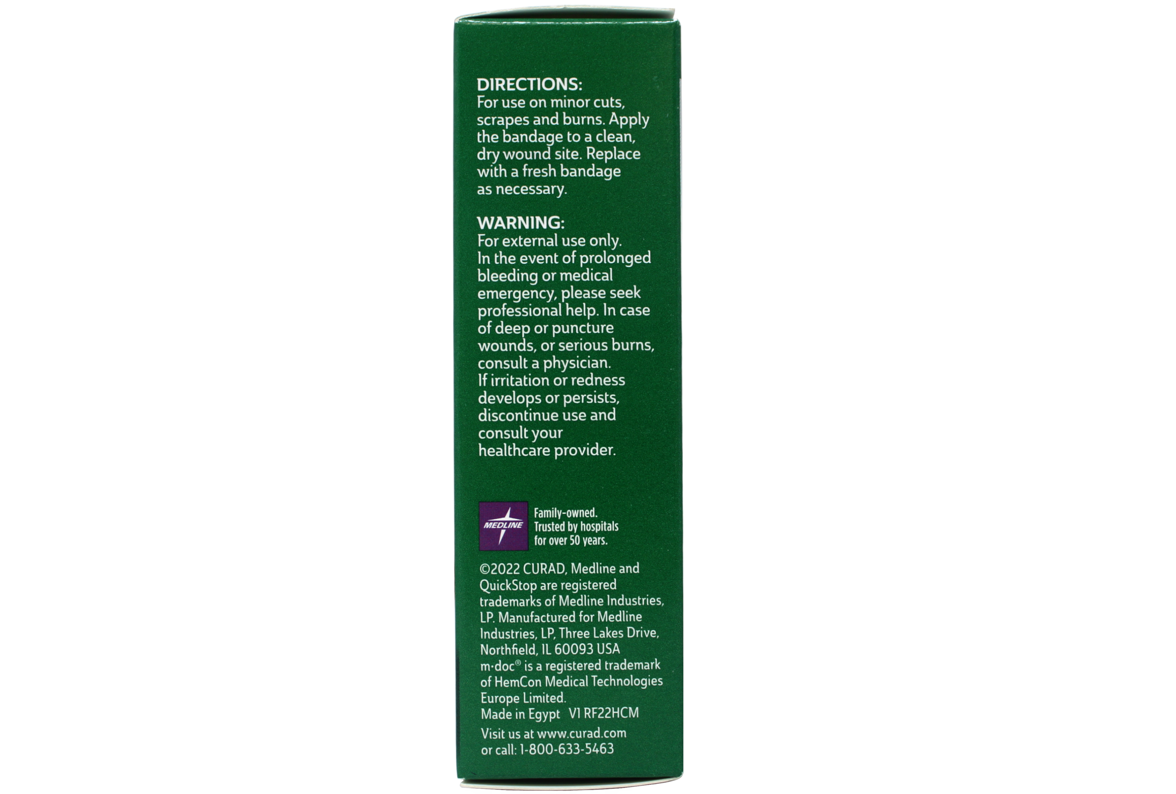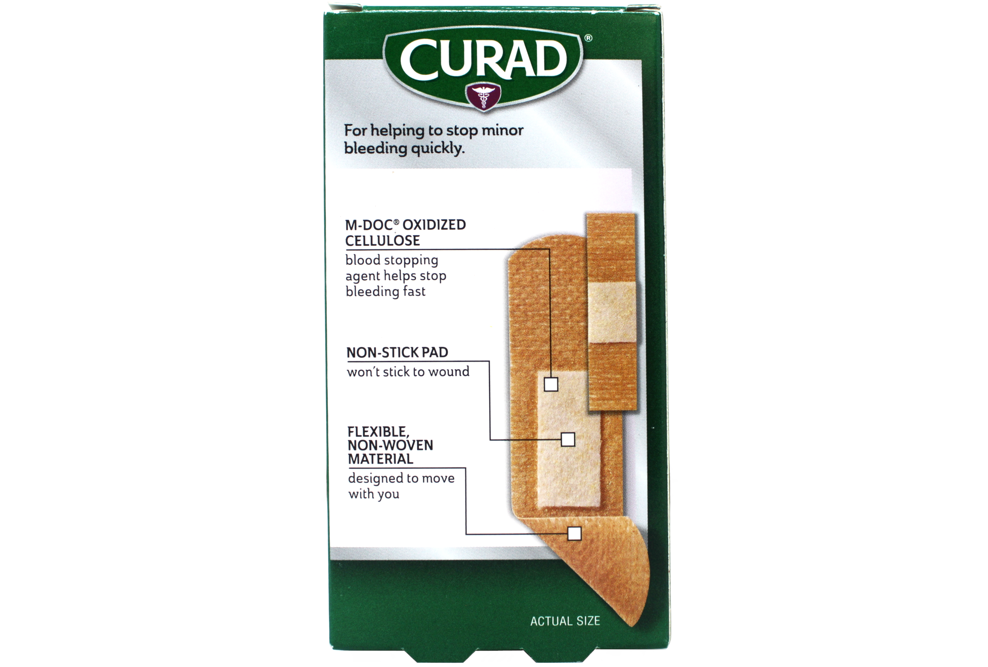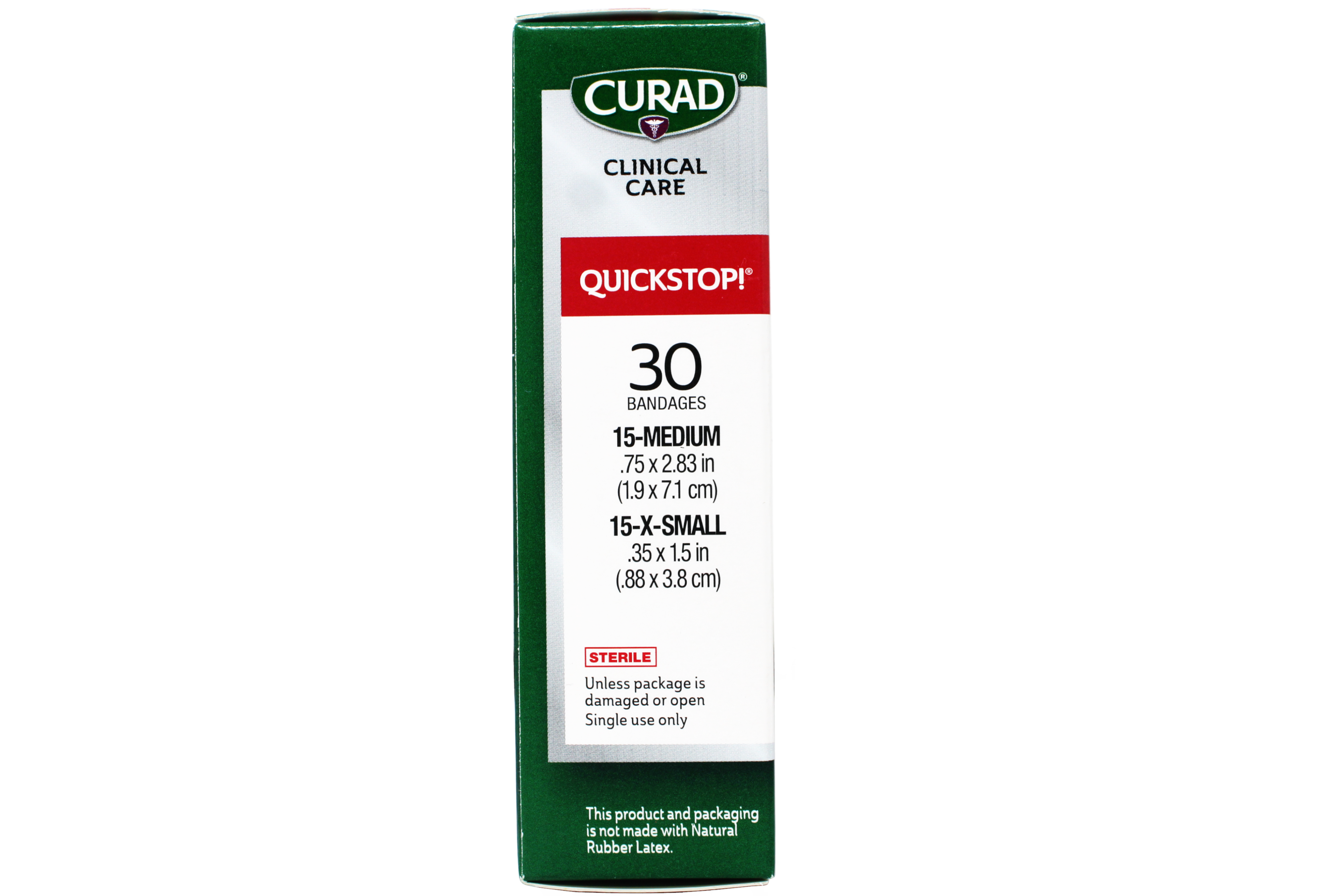 What makes Quickstop! Bleeding Control Bandages so effective? HELPS STOP MINOR BLEEDING FAST: intended to help stop persistent or recurring bleeding from minor wounds BLOOD STOPPING AGENT: m·doc Active® forms gel-like layer to help stop bleeding NON-STICK PADS: won’t stick to or disrupt the wound from healing 4-SIDED SEAL: each bandage has a 4-sided seal around the wound to keep out dirt and germs 2X MORE ABSORBENT: wound pad is 2X more absorbent when compared to its dry weight. CURAD® QuickStop! Bandages contain an m·doc Active®, a blood-stopping agent, that when in contact with blood, forms a gel like layer to help stop minor bleeding fast. These flexible strips won’t inhibit movement, and the non-stick bandage pad allows for easy removal once blood has coagulated. Superior protection for recurring bleeding.A bleeding wound may be a nuisance to you – or a trauma for your kids. CURAD QuickStop bandages and spray help stop minor bleeding quickly. CURAD QuickStop products naturally-derived clotting agent reacts instantly with blood to create a soft covering layer that not only helps to stop bleeding, it can also help keep it from recurr
