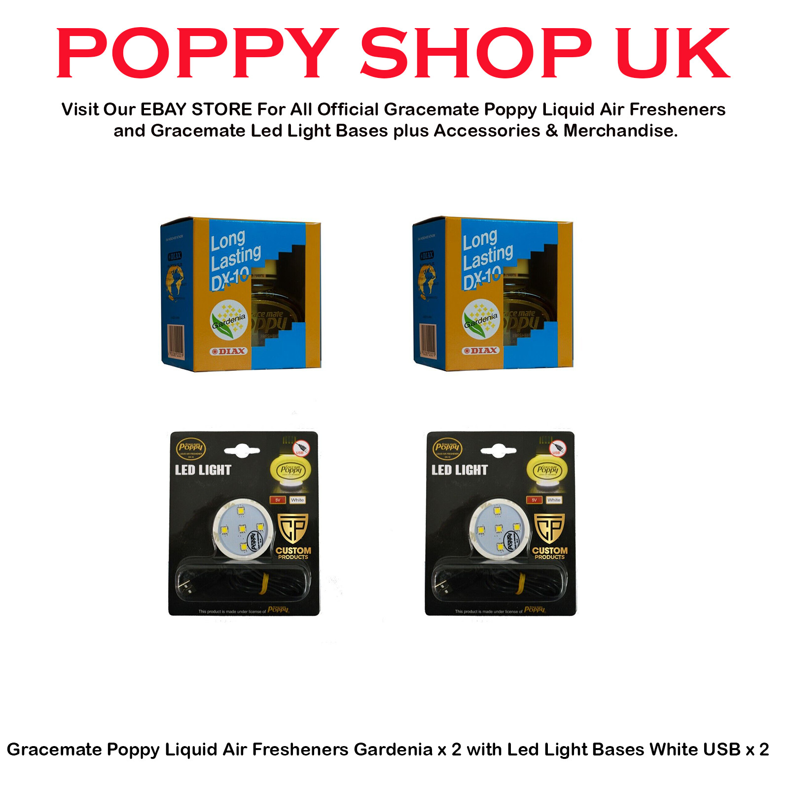 2 x Genuine Gracemate Poppy Gardenia Liquid 150ml Air Fresheners and 2 x Gracemate White LED Light Bases with USB Fitting