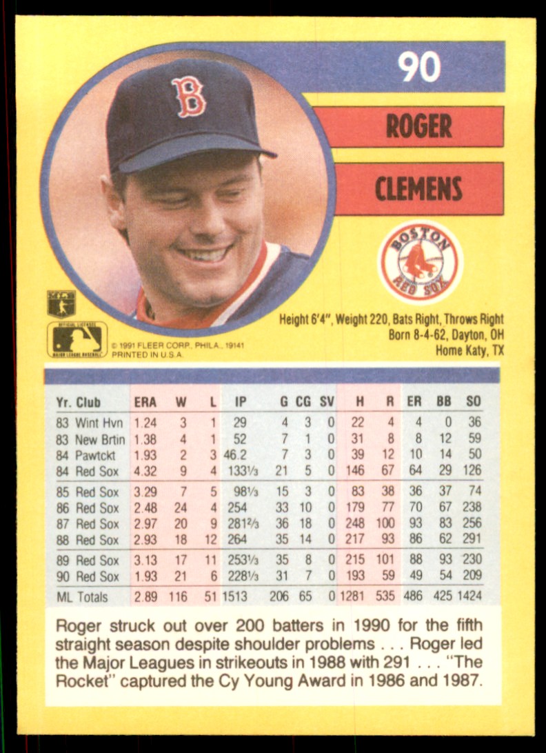 | Description: | Roger Clemens | | Category: | Baseball | | Year: | 1991 | | Product: | Fleer | | Team: | Baseball Cards | | Card Number: | 90 | | Dimensions: | 3½" x 2½" |