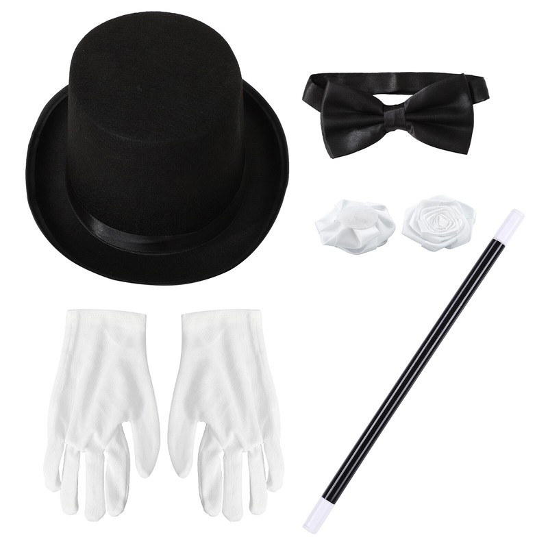 You will get 1pc hat, 1pc bow tie, 1pc magic wand, 2pcs ribbon roses and a pair of gloves. All-in-one accessories meet dress-up party needs.