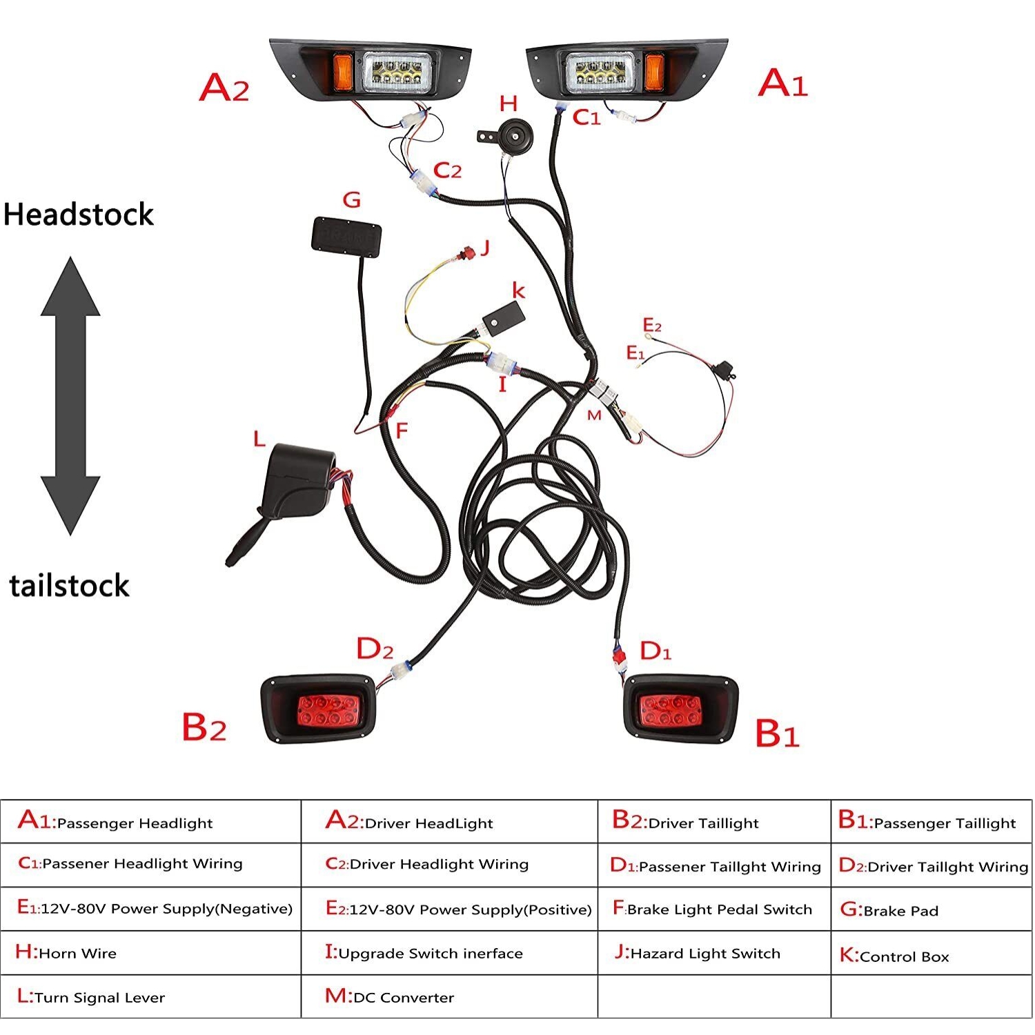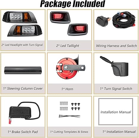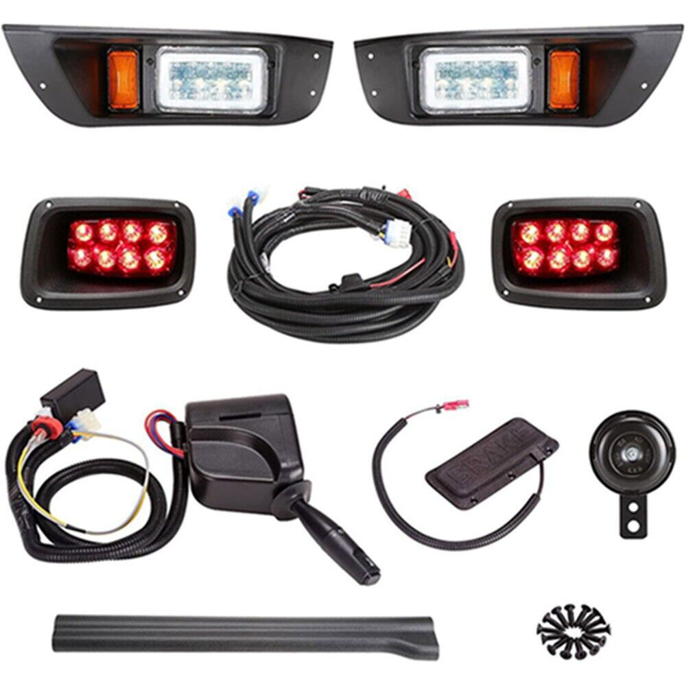 - Our Full LED Light Kit includes a bumper-mounted amber LED turn signal headlight, two LED tail lights, a horn, wiring harness, fuse harness, standard turn signal switch, steering wheel cover, hazard switch, brake pedal, controller, and installation manual.