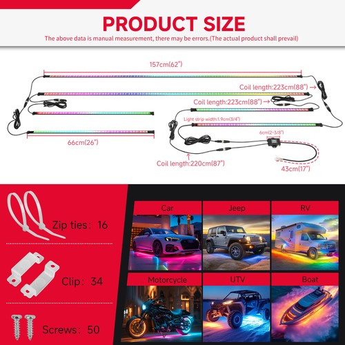- Easy Installation : LED lights with quick connect plugs and pre-applied adhesive tape to apply the LED strips under the car. Can be used in a variety of Interior and exterior applications including all Cars, SUVs, JK, JL, Vans, Trucks, Boats, Pickup decorations, etc.
