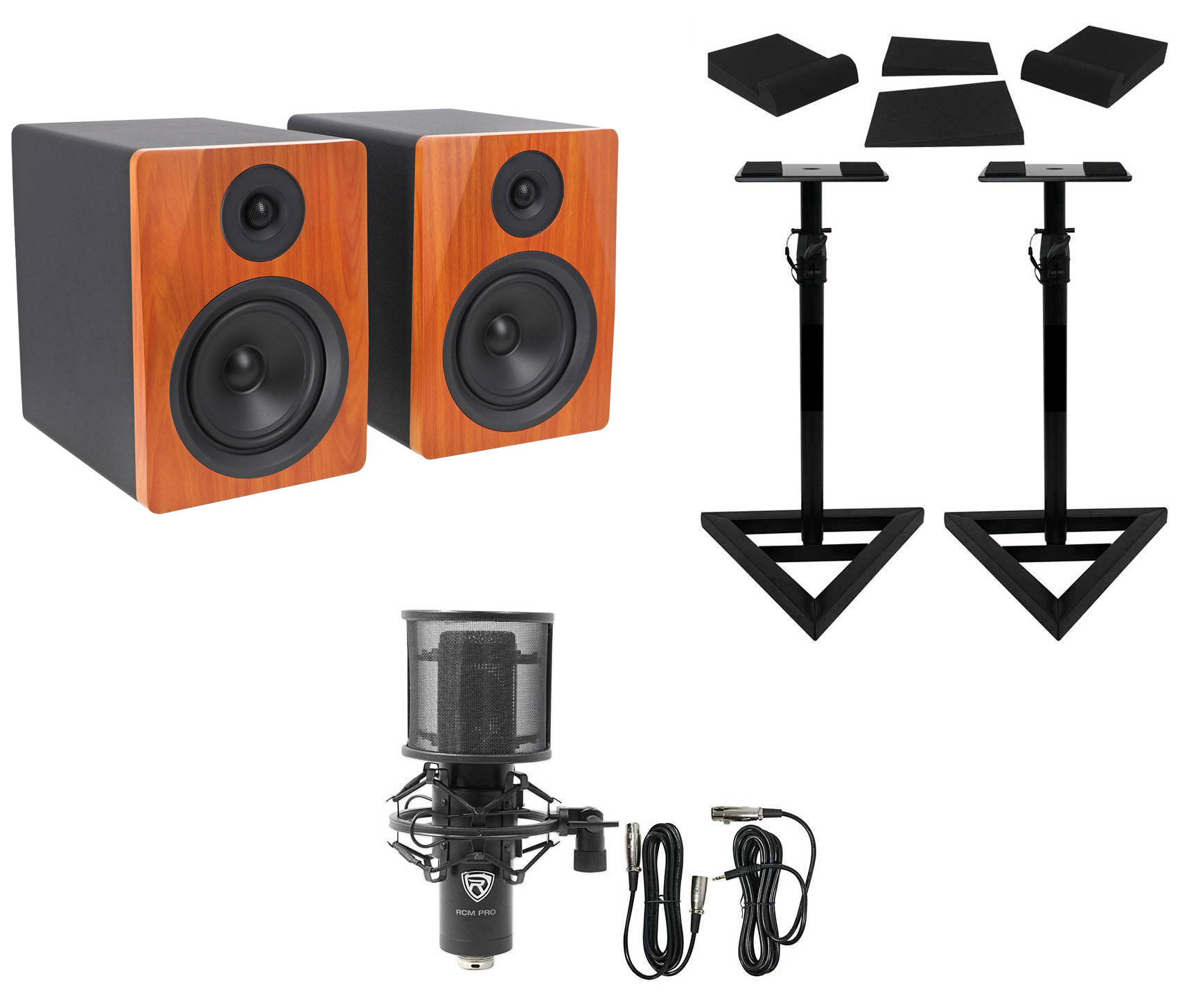 Package: Pair of Rockville APM5C 5.25" 2-Way 250 Watt Powered USB Studio Monitor Speakers in Classic Wood Finish + Pair of Brand New Rockville RVSM1 Heavy Duty Near-Field Studio Monitor Stands w/ Adjustable Height for Use in any Studio Environment w/ Adjustable Height for Use in any Studio Environment + Pair of Rockville RRS190S High Density Foam Studio Monitor Isolation Pads 7.5" x 9.5" with 3 Angle Adjustments + Rockville RCM PRO Professional Studio/Recording Condenser Microphone