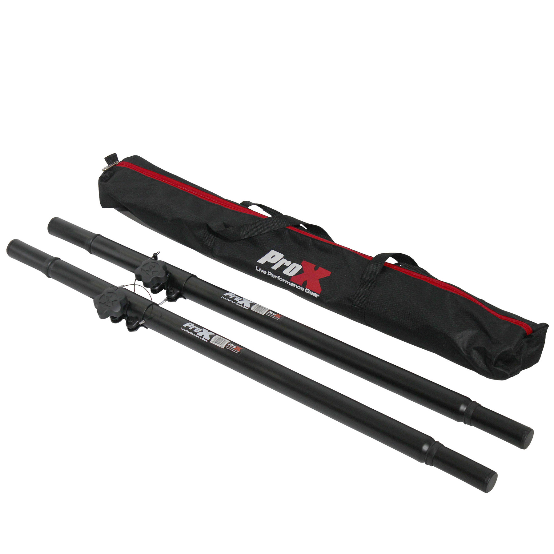 The ProX X-SAAMX2PKG is a package of 2 T-SAA-M poles and exactly what you need for your subwoofer-speaker PA system plus it comes with a carrying bag for the pair. They are adjustable in height from 32" to 63" and mounts between a subwoofer cabinet with a top mounting hole and a speaker with a bottom mounting hole sized at 1 3/8" (35mm). The T-SAA-M features both a friction locking knob and a security pin system and is made from durable steel.
