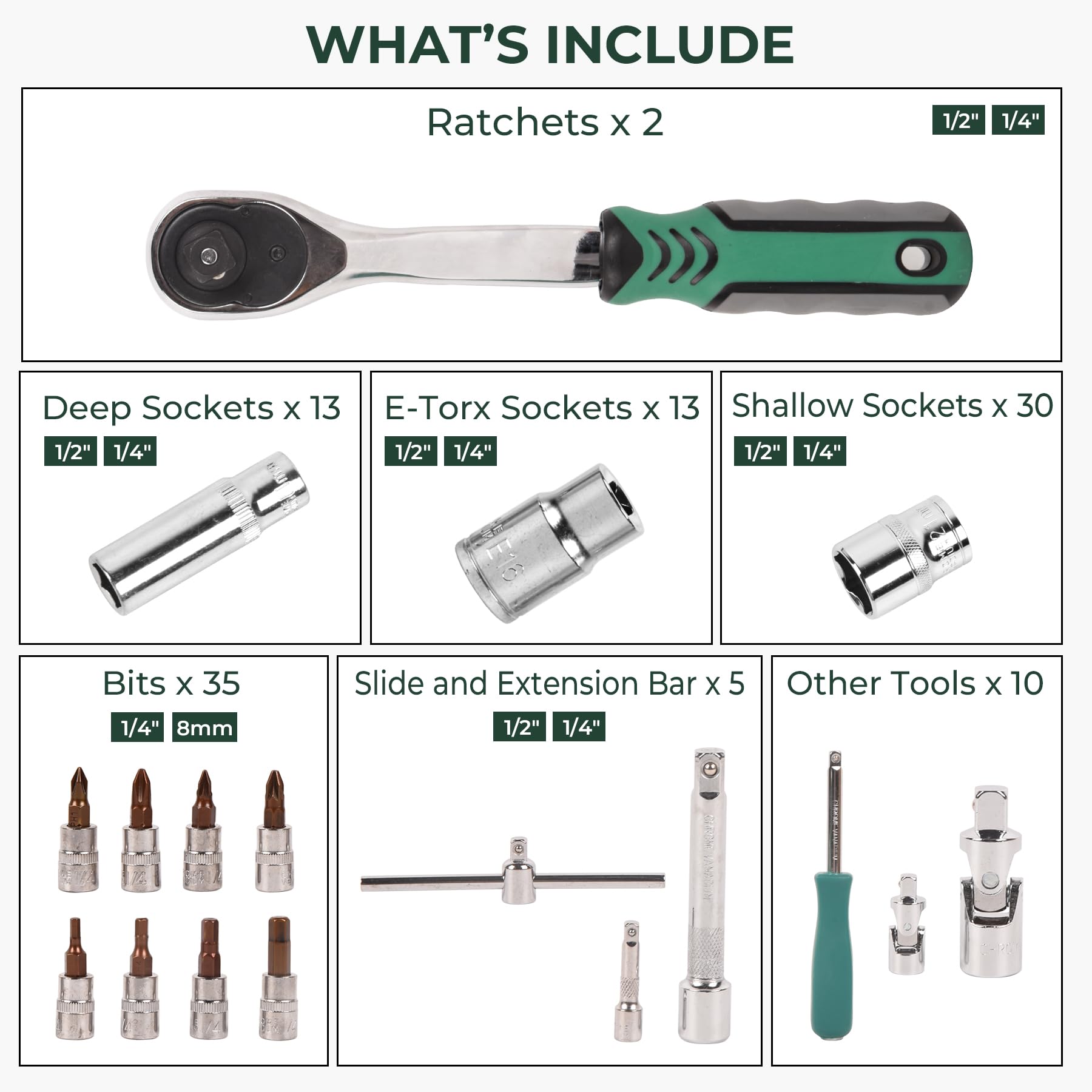 A wide range of sockets in both 1/2" and 1/4" drive sizes