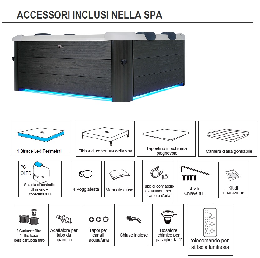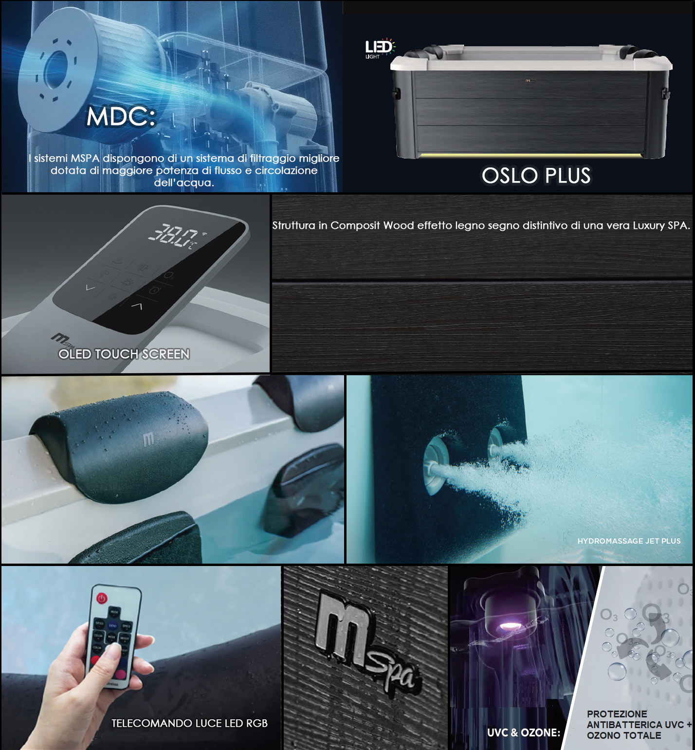 COMPRENSIVA DI TUTTI GLI ACCESSORI DESCRITTI LA MSPA OSLO PLUS KING HA NUOVE TECNOLOGIE: (NUOVO PC OLED - 4 STRISCE LED MULTICOLORE PERIMETRALI - WI-FI CONNECTION REMOTE IN SMARTPHONE APP - TELECOMANDO RGB - COPERTURA TERMICA - BOX ALL IN ONE (GESTIONE COMPUTER) - TELO APPOGGIO - MATERASSINO GALLEGGIANTE RISCALDANTE - CUSCINI PER UNA COMODA SEDUTA + CUSCINI BACK REST + CUSCINI SUL BORDO VASCA - NUOVO RISCALDATORE DA 2200WATT (ECO TECH A BASSO CONSUMO EFFETTIVO) - SISTEMA DI SANIFICAZIONE AD OZONO - SISTEMA UVC SANIFICAZIONE ANTIBATTERICA - SISTEMA ANTIGELO - POMPA ARIA + POMPA ACQUA - BLOCCO DI SICUREZZA PER BAMBINI - REGOLAZIONE INTENSITA' DELLA POMPA A 3 VELOCITA' ECO CONSUMO - FILTRO INTELLIGENTE - TIMER OROLOGIO - 2 FILTRI - ADATTATORE - SKIMMER / (DOSATORE) PER PRODOTTI INCLUSO - MANUALE D'USO COMPLETO).