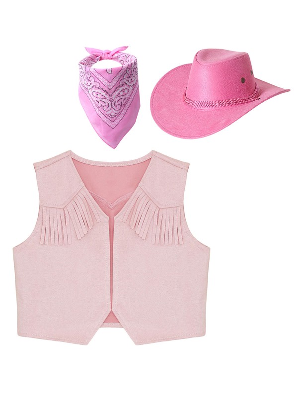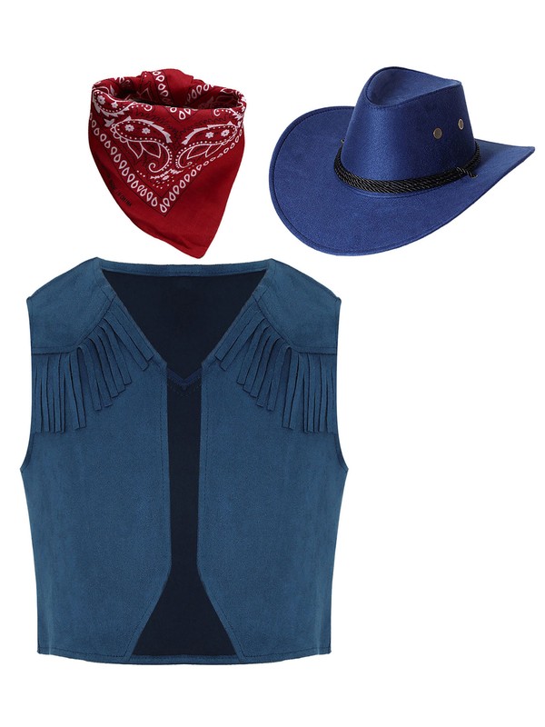 Solid color vest is designed with open front, unlined, pointed hem and tassel details. Matching with a cowboy hat and bandanna.