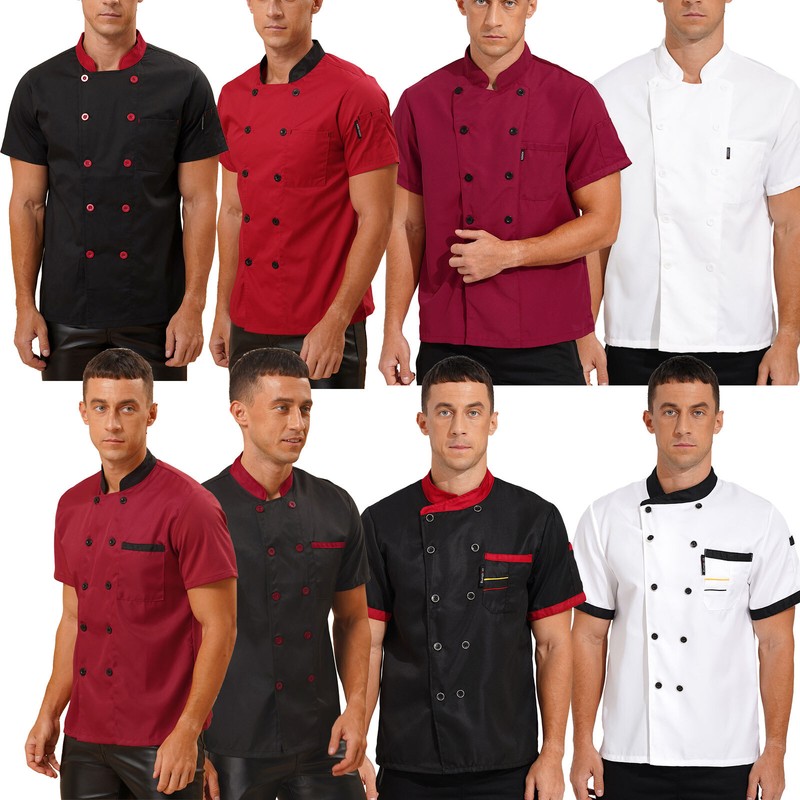 Unisex chef jacket with double-breasted for easy wearing, contrast color stand collar and details. Come with a hat.