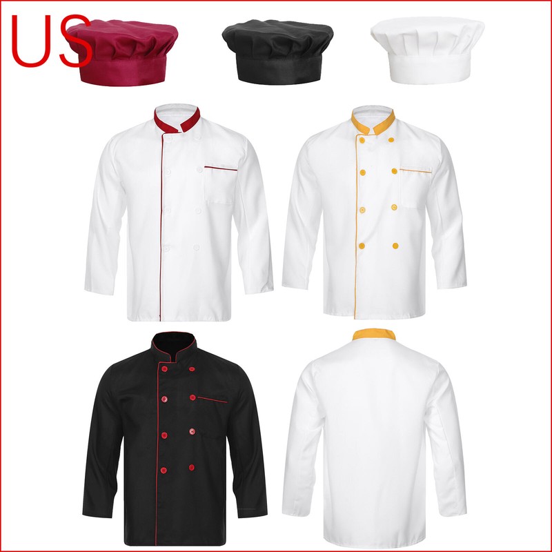 US Men Women Long Sleeve Food Service Uniform with Hat Hotel Kitchen Chef Jacket
