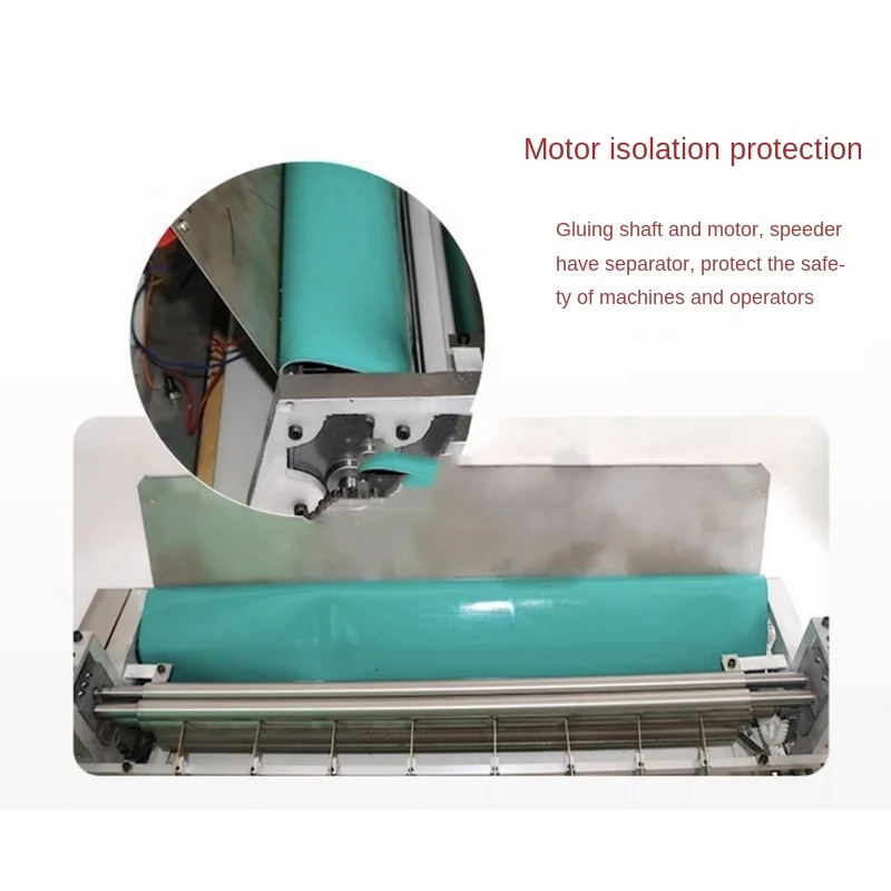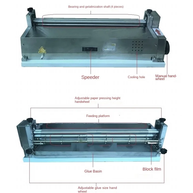 Product Name: Desktop Stainless Steel Speed Adjustable Glue Machine Glue width 380mm Gluing speed: 0-40 m/min Motor power 120W Dimensions 600*410*360m Mechanical weight 30kg Working voltage 220V Applicable materials with a thickness of 80 grams or more paper (0.1mm)
