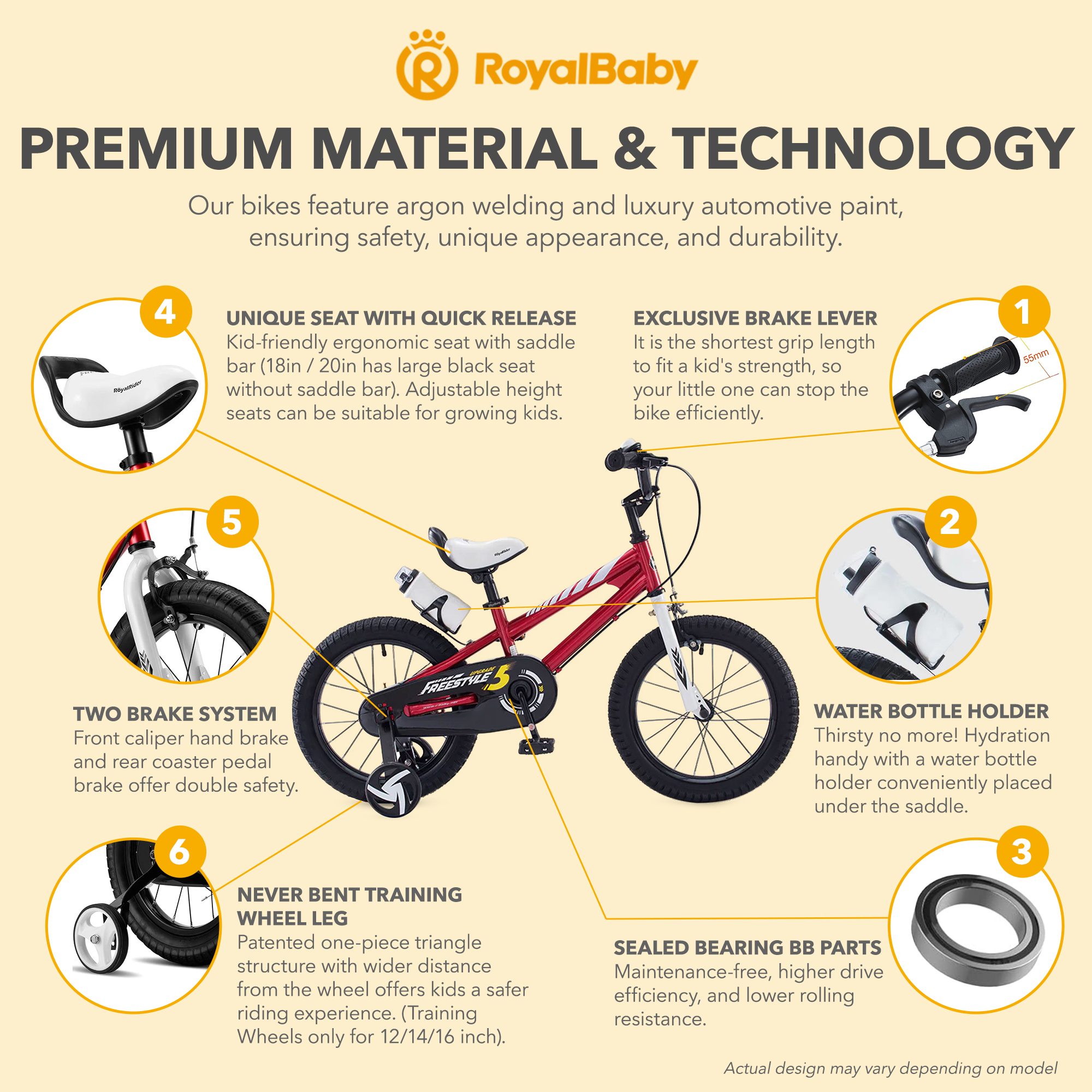 • Equipped with RoyalBaby patented sealed bearing for smooth pedaling while the never-bent training wheels and seat holder help maintain balance while learning to ride