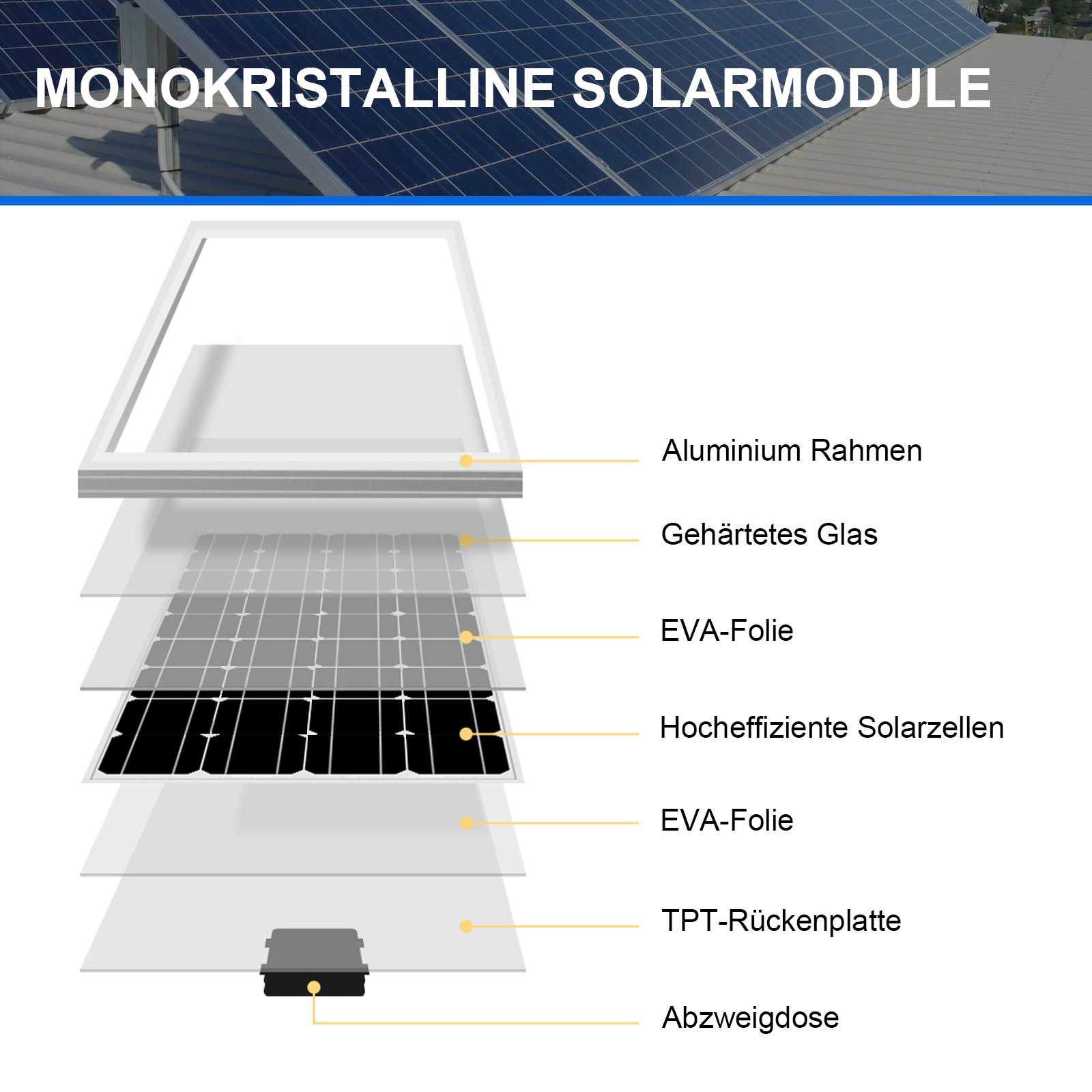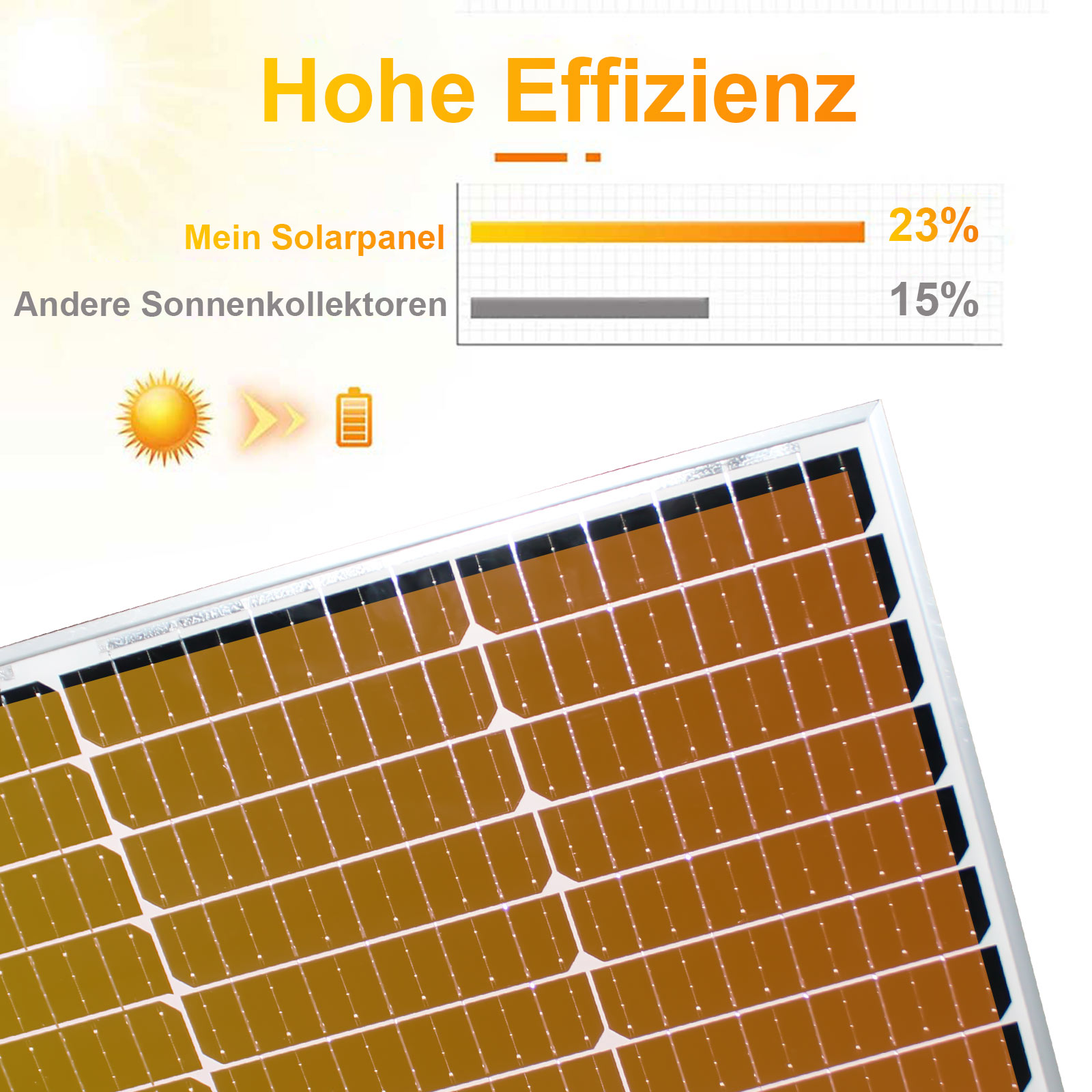 Solaranschlusskabeln und einer Anschlussdose geliefert. So können Sie es installieren, an einen Controller anschließen oder mit Panels erweitern, ohne ins Schwitzen zu geraten. Die Paneele bestehen aus erstklassigen monokristallinen Solarzellen der Klasse A+, die effizienter sind als herkömmliche polykristalline Solarzellen.