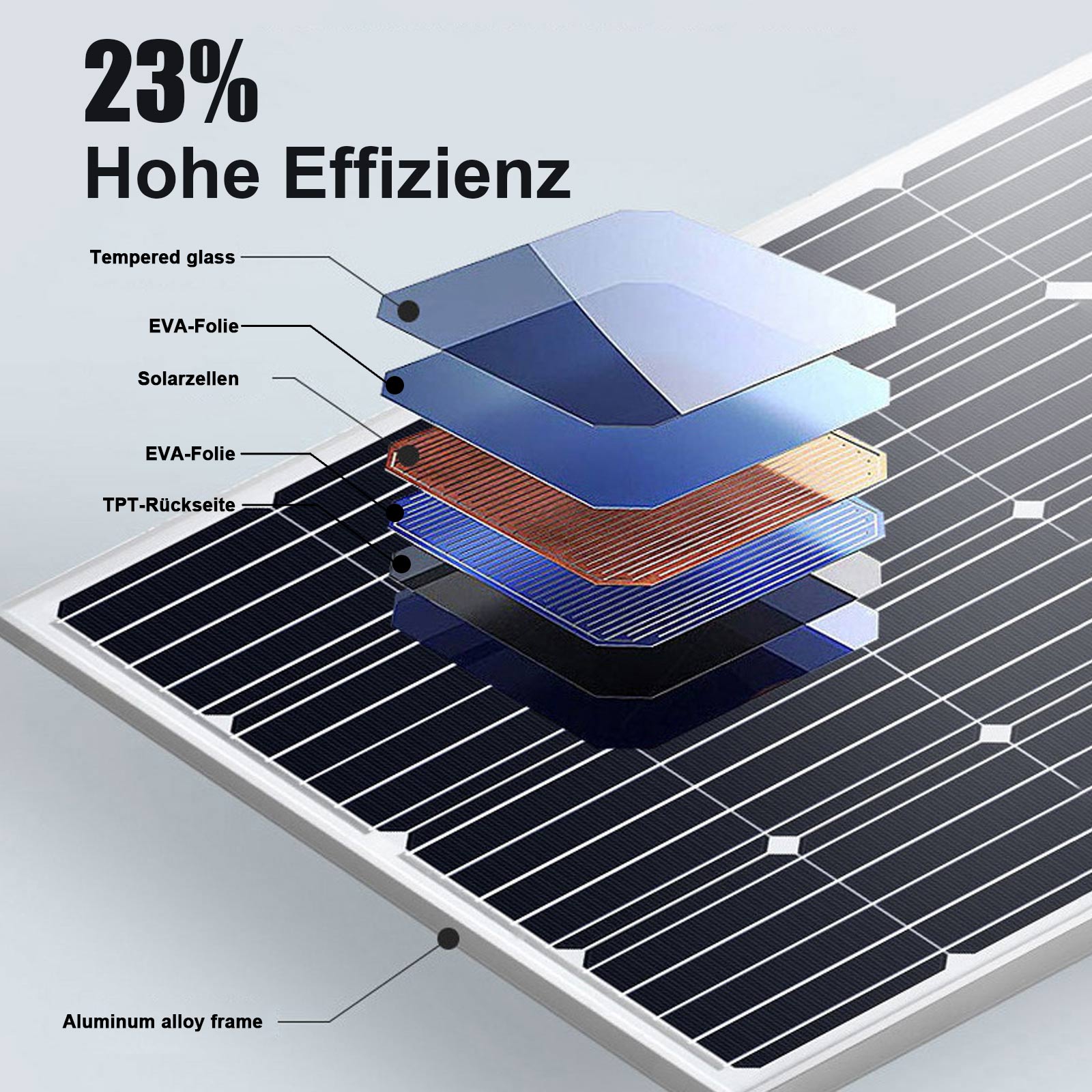 Ideal für Wohnmobile, Wohnmobile, Hütten, Meeresgebiete, Heimstromversorgung und mehr. Die Paneele verfügen über leichte Aluminiumrahmen und bruchsicheres Glas, wodurch sie sich perfekt für Außenanwendungen eignen.