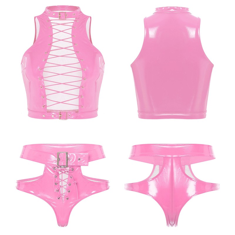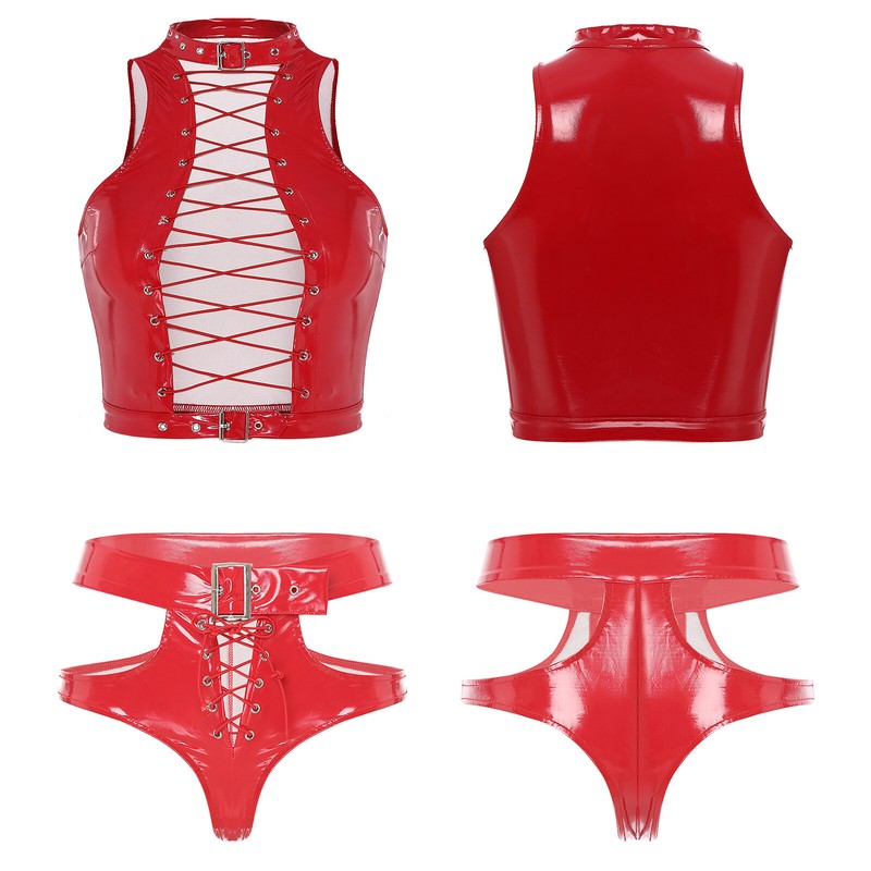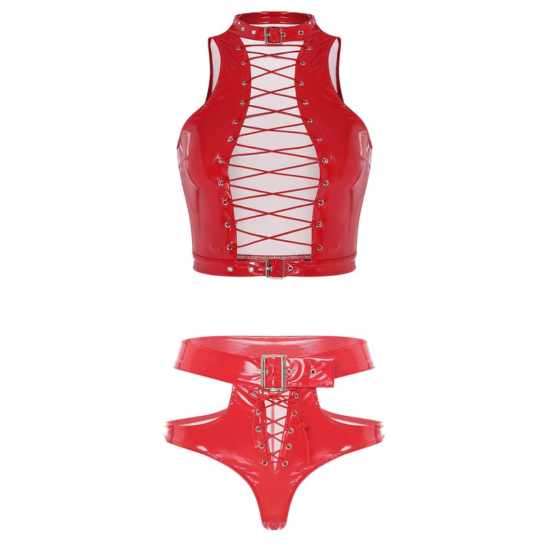 The patent leather briefs with stylish cutout, lace-up and adjustable buckle belt make you spper charming.
