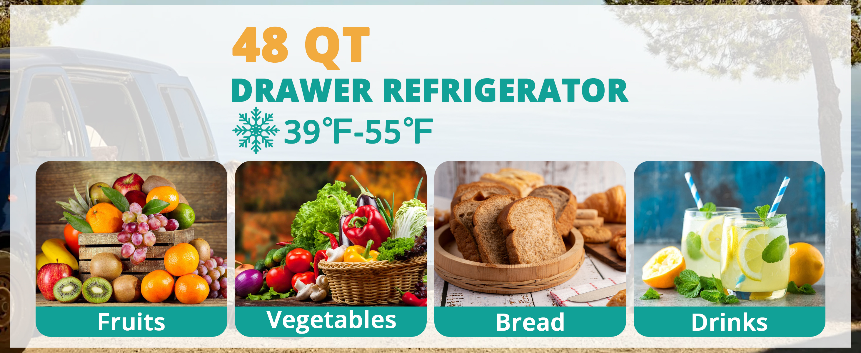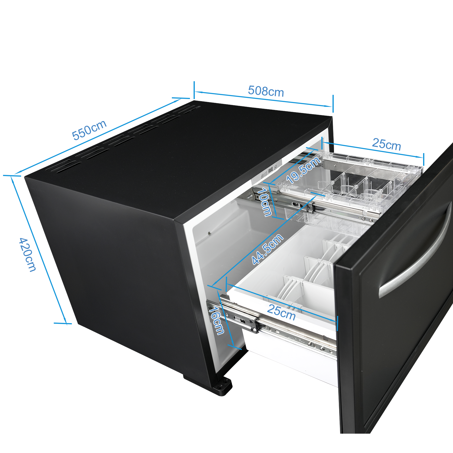 1.6 CU.FT Drawer Refrigerator - Out size: 21.7*20*16.5, perfect for RV life, camping and small space. 12V refrigerator with removable dividers allow flexible, organized space for items of various sizes. Enjoy ice drinks anytime and anywhere.