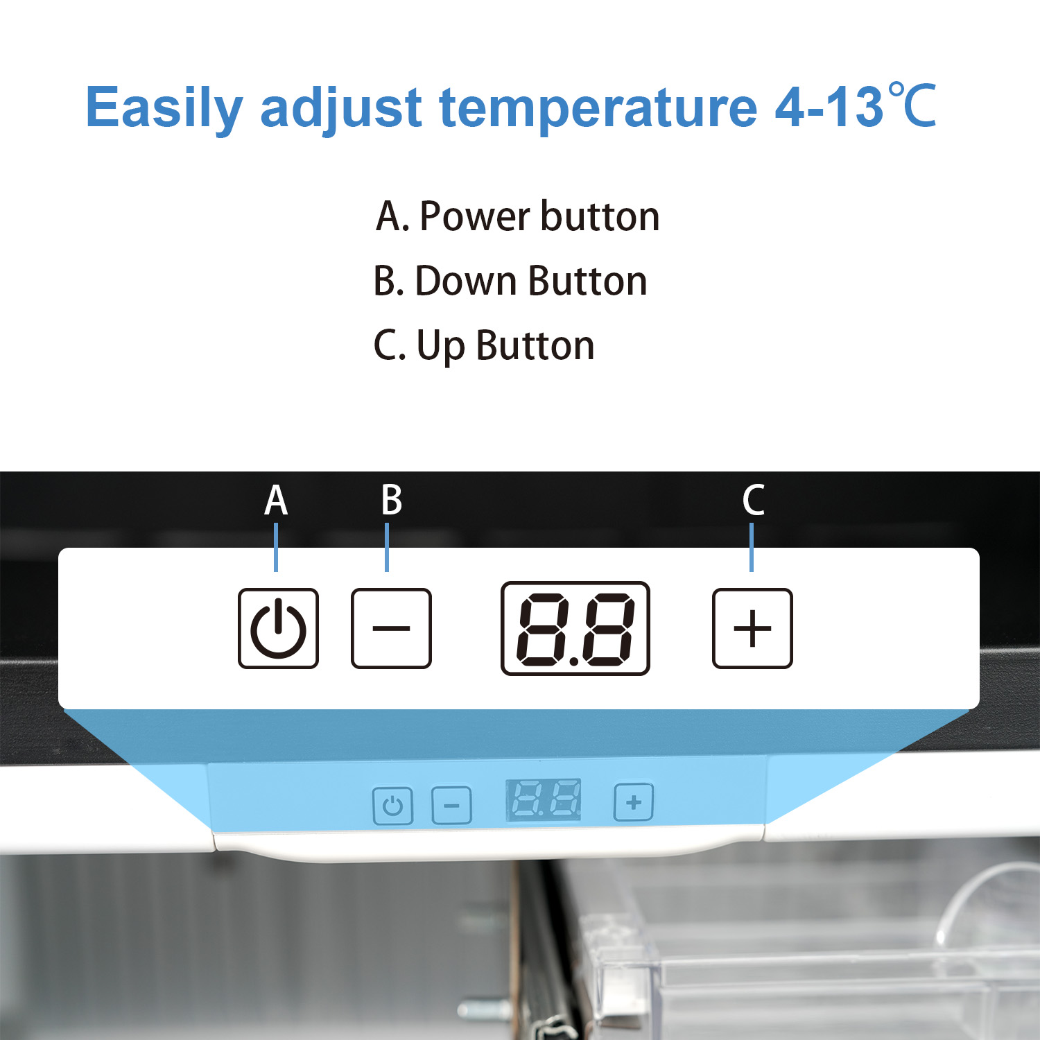 Button A : Power button ; Buttons B and C: Adjust the temperature setting. The digital display shows the temperature setting.