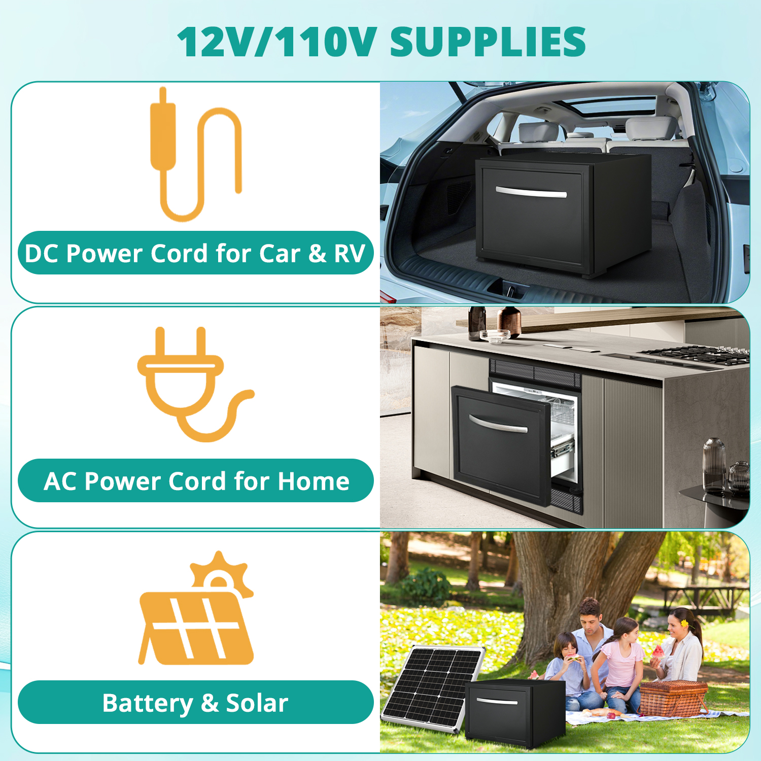 Dual Power Source Drawer Refrigerator- Easily switch between 110V AC for home use and 12V DC for on-the-go convenience in RVs, trucks, or during camping trips