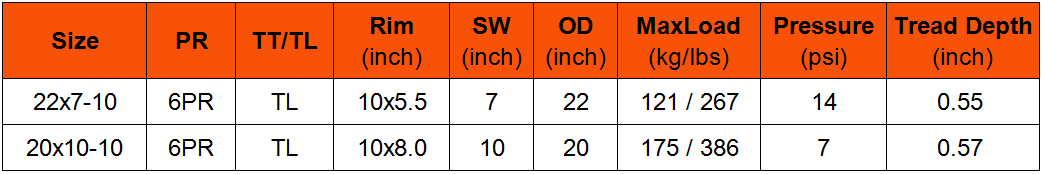 Tire Size: 22x7-10 Front & 20x10-10 Rear