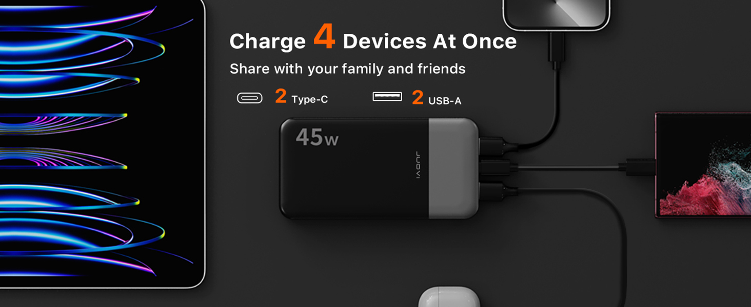 【Charge 4 Devices At Once】JUOVI usb c portable charger has 2 USB A ports and 2 Type C ports, which can power 4 devices at the same time, multiple people can share the power supply without queuing.Perfectly suited the needs of travelers,business professionals, students, and anyone who needs to keep their devices charged on the go.