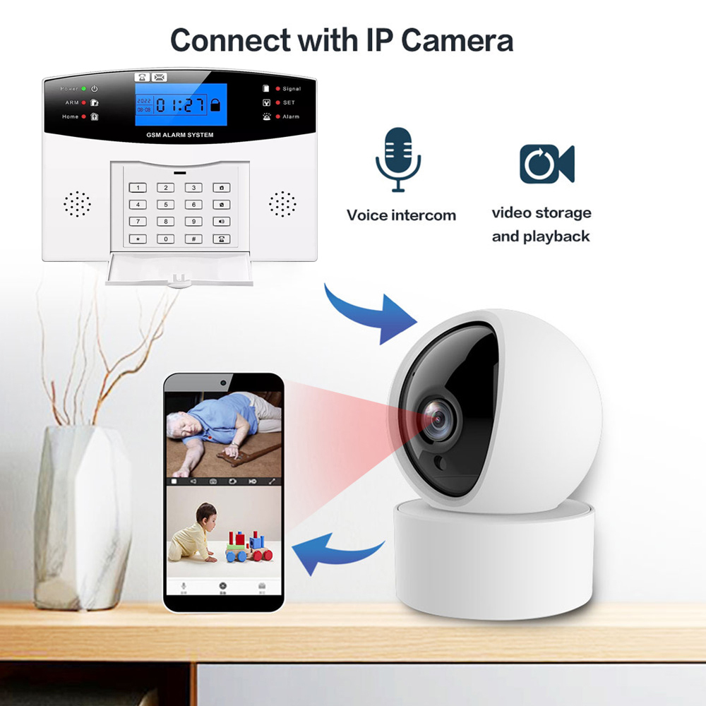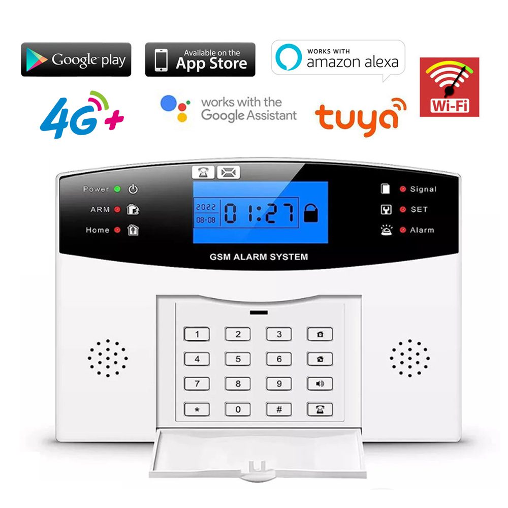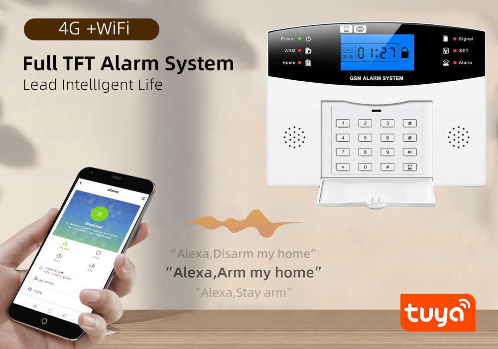 A: Compatible with Alexa and Google home: This alarm sysetm works with Amazon Alexa and Google Home for voice control ( Alexa and google home devices not included ). Just ask app Alexa on your phone to Arm / Disarm/ the whole system in a specific instruction like "Alexa, please arm the alarm system". Remote control your Alarm system anywhere in the world with your smart cell phone, no need repeated operation!