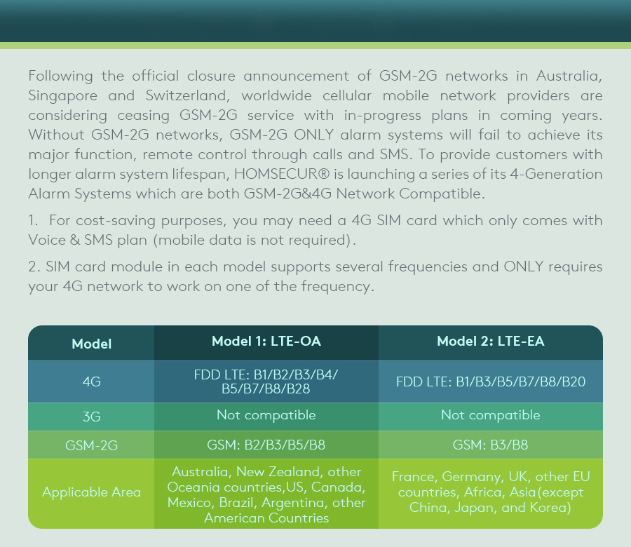 Because Australia, United States, Canada has cut the 2G sim card service. And United Kingdom, Mexico, Euro Union, ect will cut the 2G sim card in coming years. Without 2G networks, 2G/GSM only alarm system will fail to achieve it's major function, remote control through calls and SMS. To provide customers with longer alarm system lifespan, our company is launching a series of it's 4G alarm system which are both 4G/3G/2G(GSM) Network compatible.